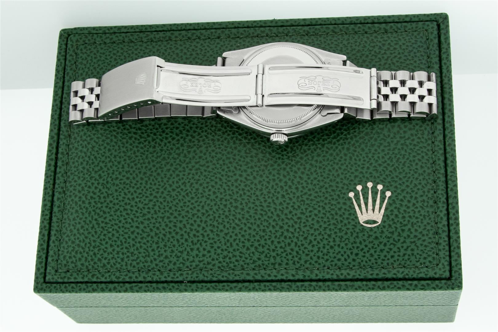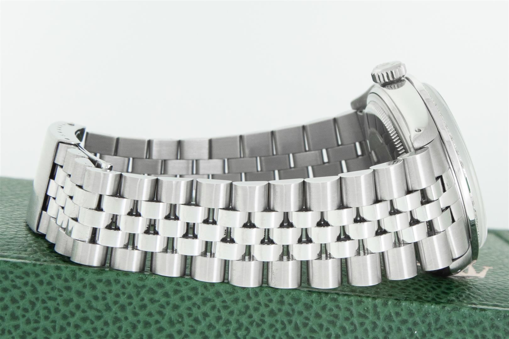 One Mens Rolex Stainless Steel Datejust Polished Bright with Satin Finish, This Watch Has Been Serviced & Electronically Tested, Stainless Steel Case: 36mm, Rolex Stainless Steel Crown, Custom Bezel: New Stainless Steel Bead-set Diamond Bezel, Diamond Count: 54 Diamonds In Bezel, Total Weight 1.00 Carat, Clarity: SI-VS, Color: G to H. Custom Crystal: New Sapphire With Magnified Date Window. Custom Hands: New Luminescent Hands. Rolex Movement: Automatic Winding Movement. Custom Dial: Refinished To Green Diamond Dial, Diamond Count: 10 Diamonds In Dial, Color: G to H, Clarity: VS2-SI1. Date Window: 3 O'clock Position Date Display, Quickset, Model: Datejust. Condition: G-6 Extra Fine. Rolex Bracelet: Stainless Steel Jubilee Band. Bright Polish & Satin Finish. 7.0 Inch Length, Adjustable. Standard Clasp, With Rolex Logo. This Preowned Watch Has Been Serviced Time Tested And Is In Excellent Condition It Is Free Of All Scratches And Dents. This Watch Comes With A Rolex Box.