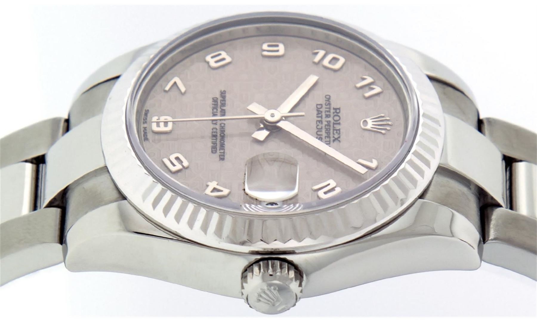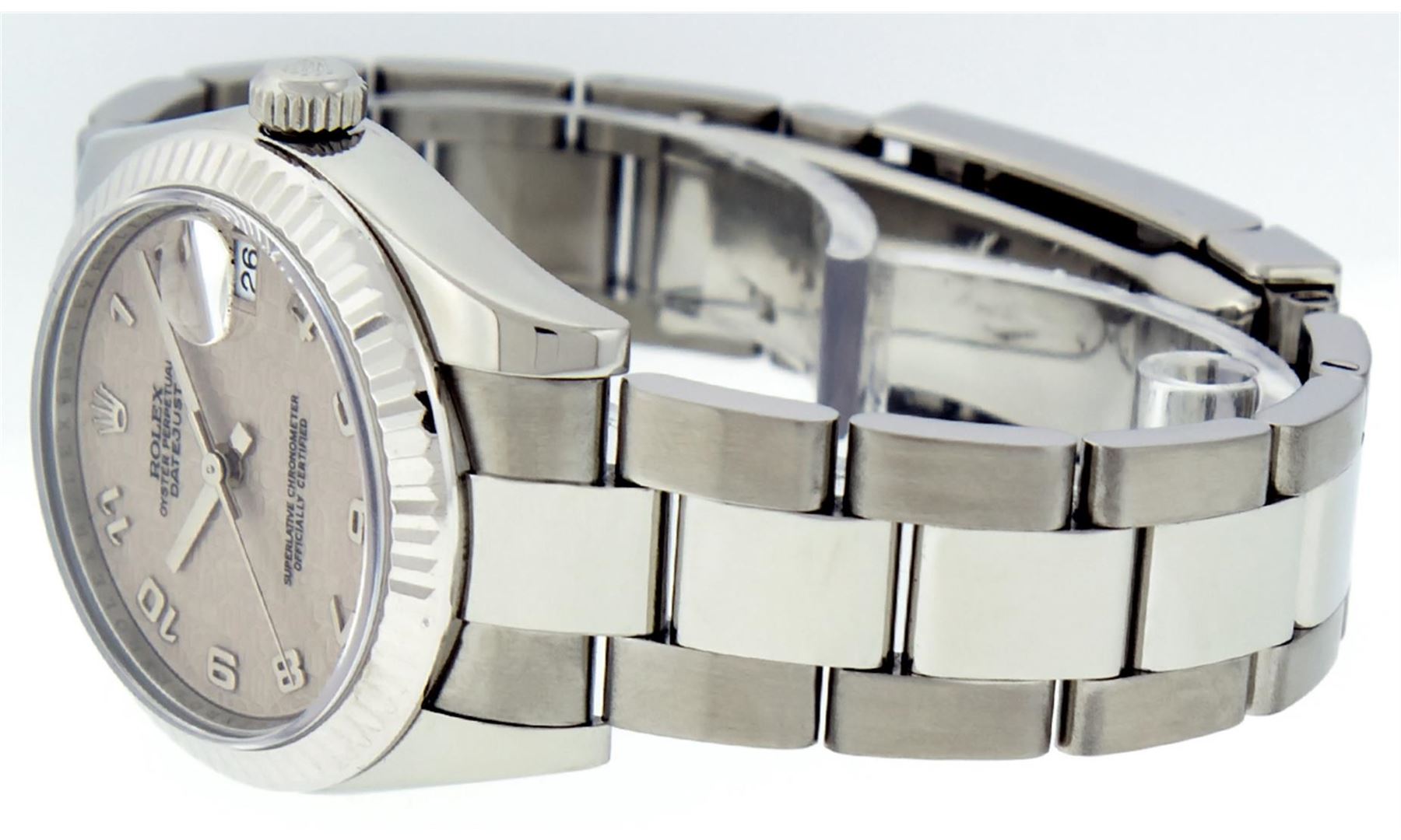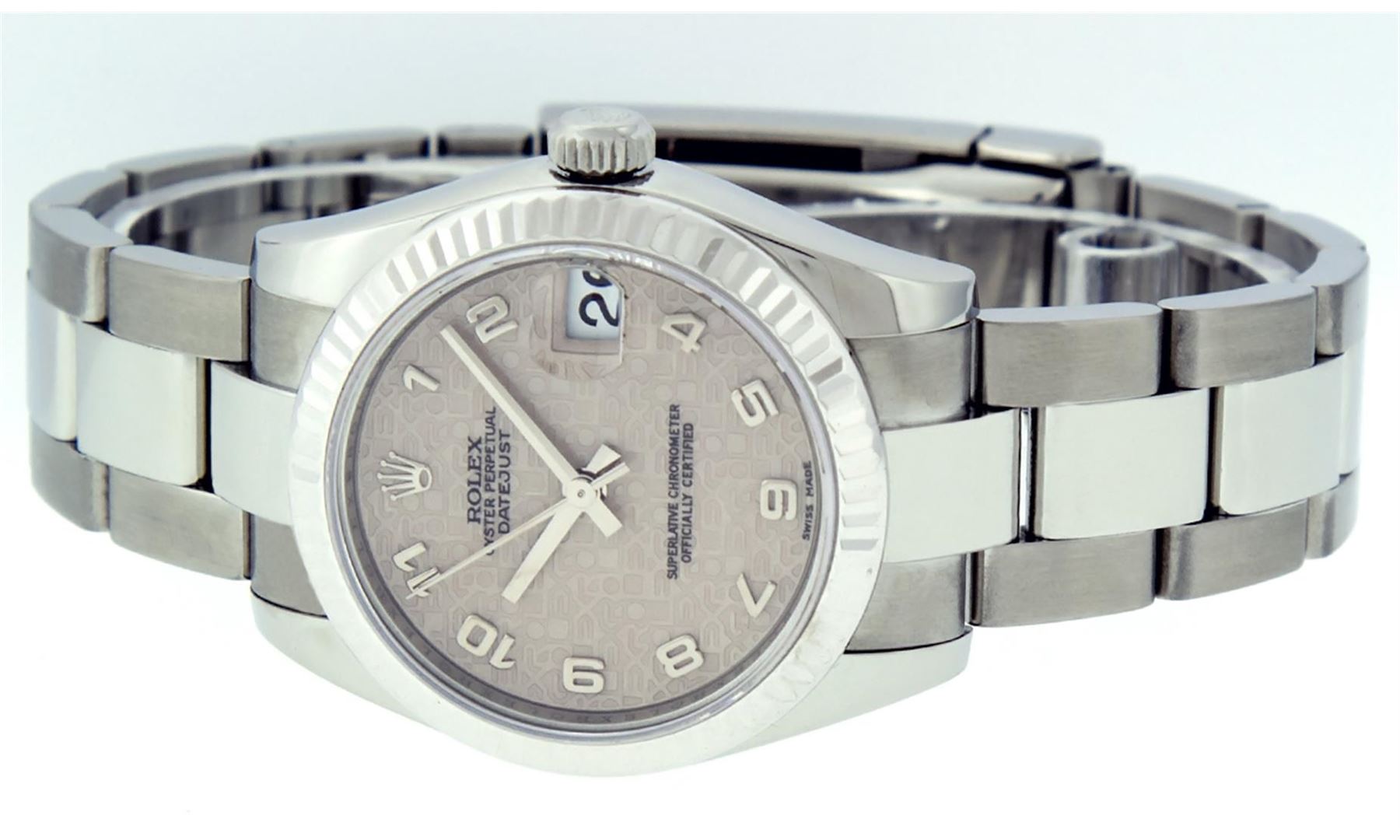 One Midsize Rolex Datejust Polished Bright with Satin Finish, Serviced & Electronically Tested, Stainless Steel Case:31mm, Stainless Steel Crown, Bezel: 18K White Gold Fluted Bezel, Crystal: Synthetic Sapphire Cyclops Lens. Movement: Automatic Winding Movement Caliber 2235. Custom Dial: White Arabic Jubilee Dial. Date Window: 3 O'Clock Position Date Display, Model: No Hole 178274 Midsize Datejust Quickset. Condition: G-6 Extra Fine. Bracelet: Stainless Steel Oyster Band. Bright Polish & Satin Finish. 6.0 Inch Length, Adjustable. Standard Clasp, With Rolex Logo.