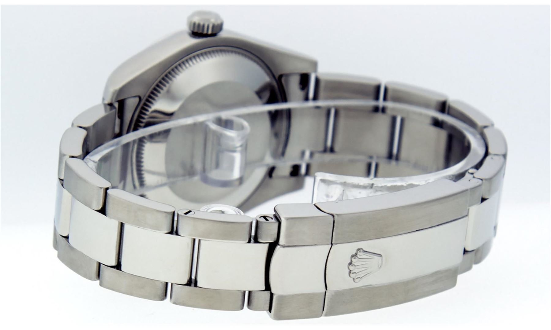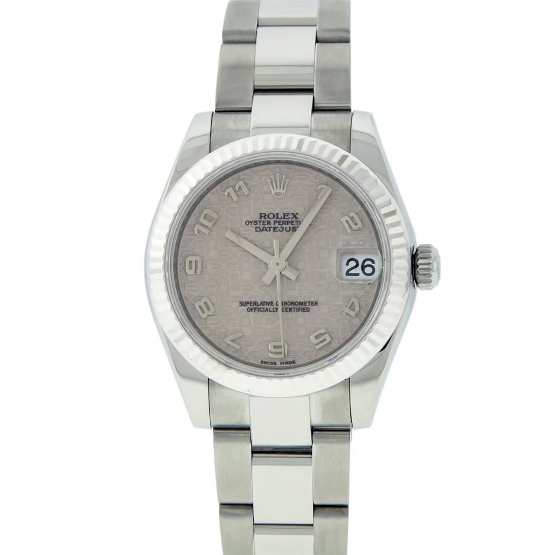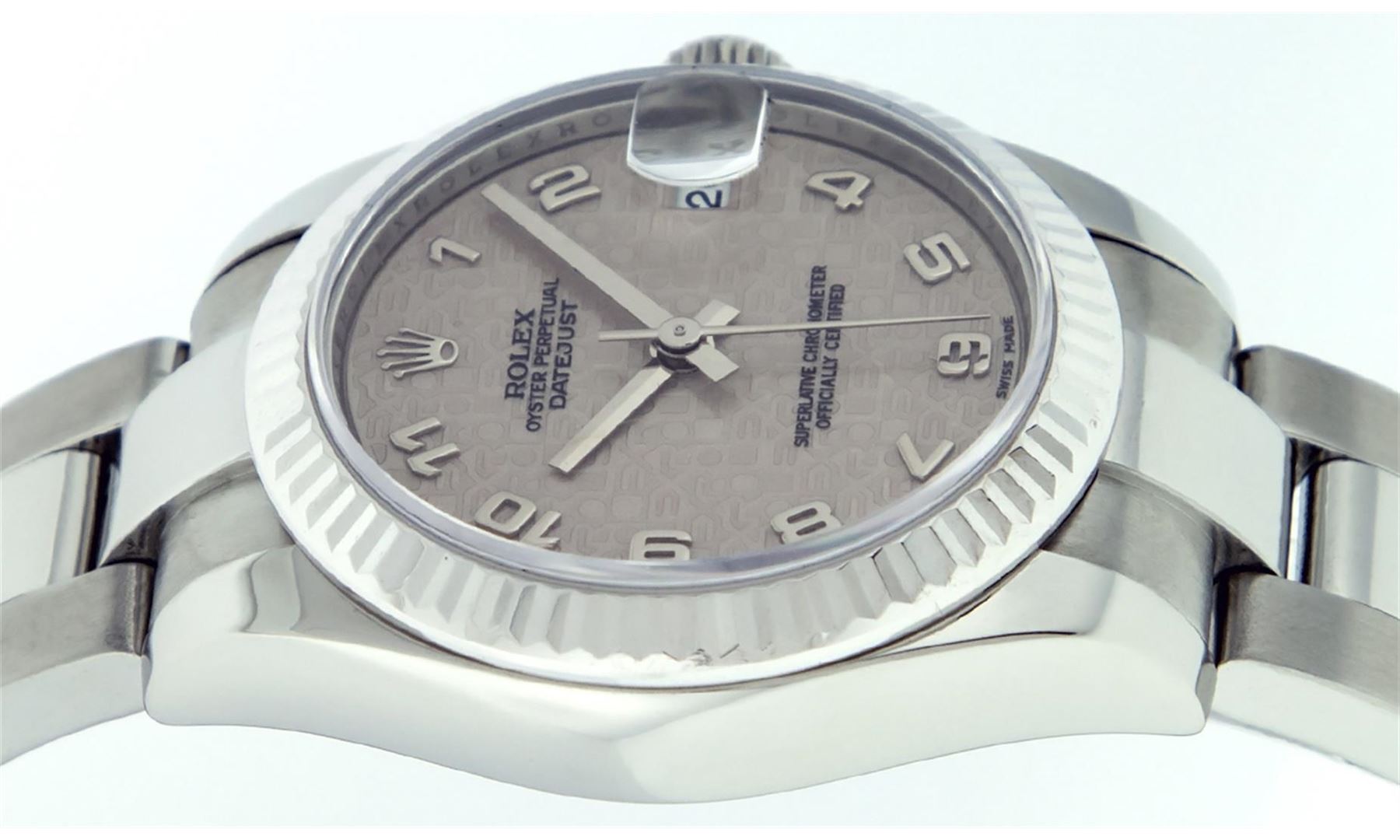 One Midsize Rolex Datejust Polished Bright with Satin Finish, Serviced & Electronically Tested, Stainless Steel Case:31mm, Stainless Steel Crown, Bezel: 18K White Gold Fluted Bezel, Crystal: Synthetic Sapphire Cyclops Lens. Movement: Automatic Winding Movement Caliber 2235. Custom Dial: White Arabic Jubilee Dial. Date Window: 3 O'Clock Position Date Display, Model: No Hole 178274 Midsize Datejust Quickset. Condition: G-6 Extra Fine. Bracelet: Stainless Steel Oyster Band. Bright Polish & Satin Finish. 6.0 Inch Length, Adjustable. Standard Clasp, With Rolex Logo.