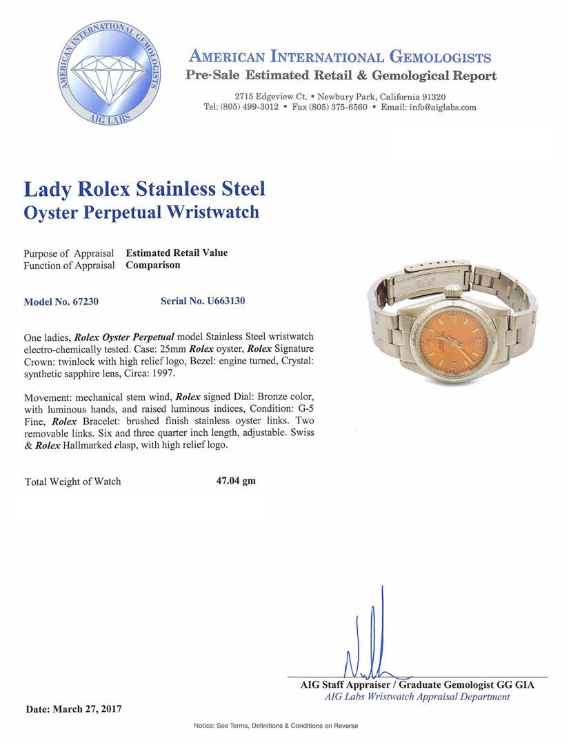 One ladies, Rolex Oyster Perpetual model Stainless Steel wristwatch electro-chemically tested. Case: 25mm Rolex oyster, Rolex Signature Crown: twinlock with high relief logo, Bezel: engine turned, Crystal: synthetic sapphire lens, Circa: 1997.Movement: mechanical stem wind, Rolex signed Dial: Bronze color, with luminous hands, and raised luminous indices, Condition: G-5 Fine, Rolex Bracelet: brushed finish stainless oyster links. Two removable links. Six and three quarter inch length, adjustable. Swiss & Rolex Hallmarked clasp, with high relief logo. Total Weight of Watch 47.04gm. AIG Appraised.