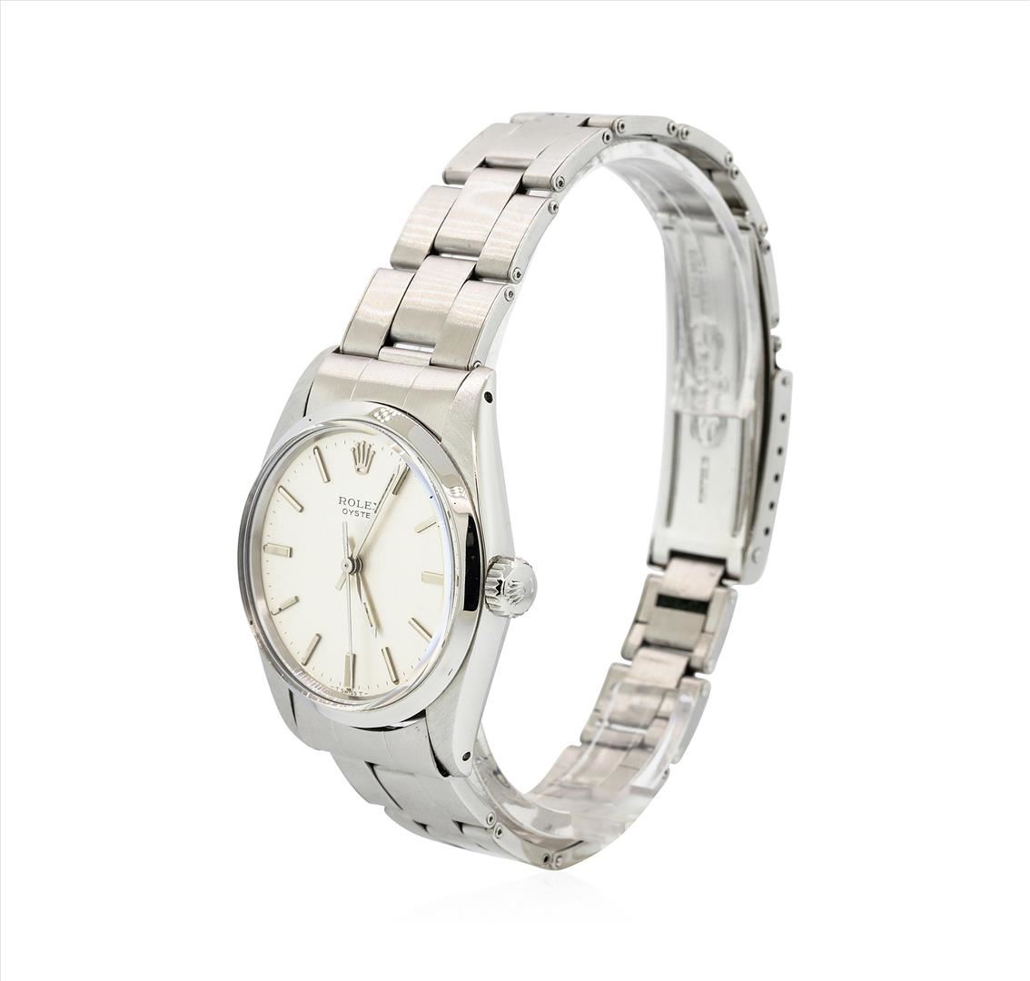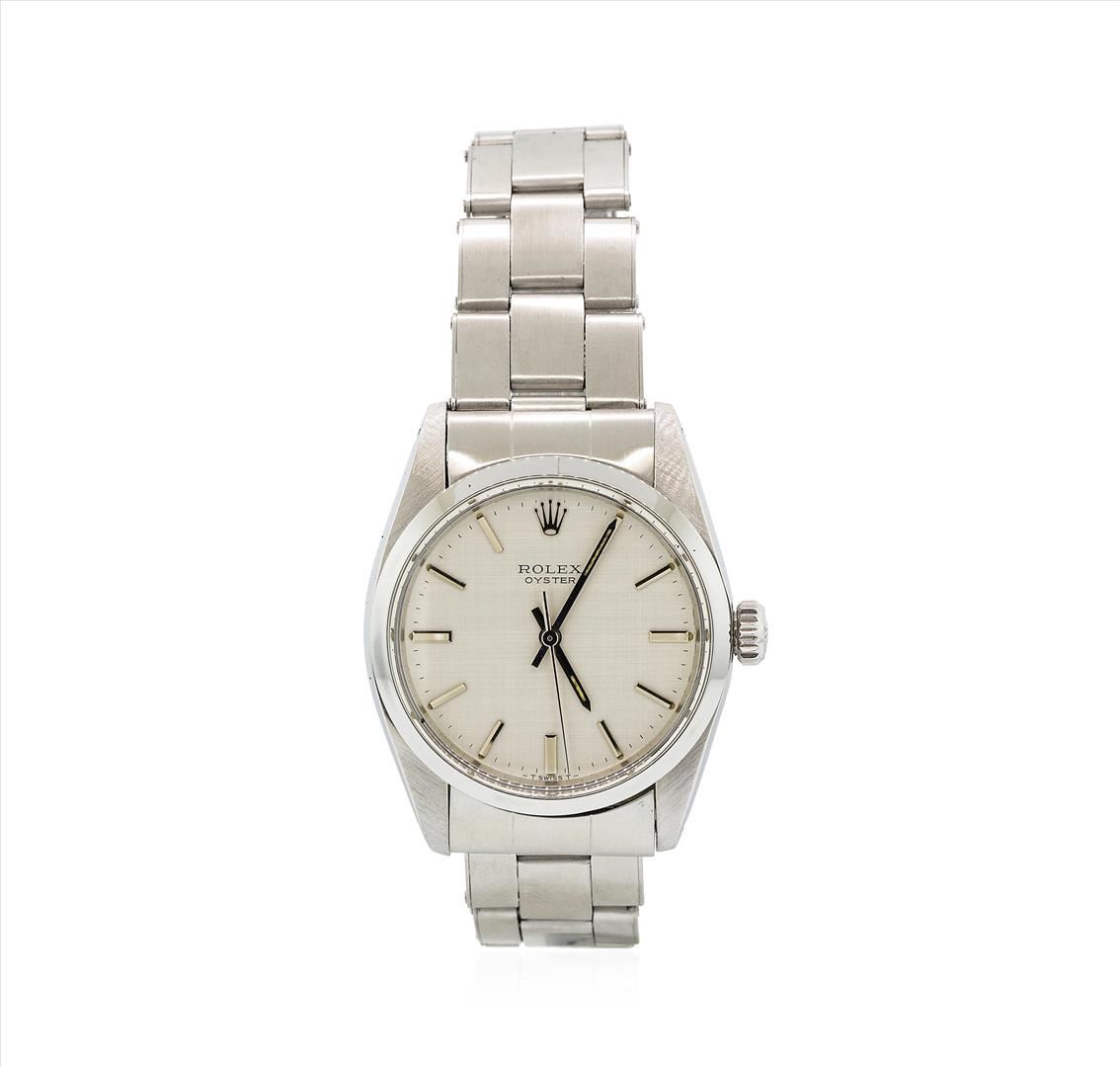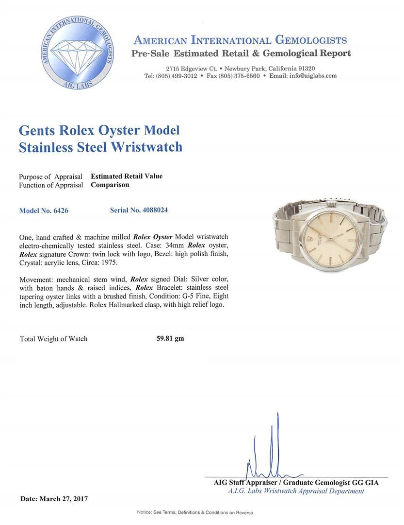 One, hand crafted & machine milled Rolex Oyster Model wristwatch electro-chemically tested stainless steel. Case: 34mm Rolex oyster, Rolex signature Crown: twin lock with logo, Bezel: high polish finish, Crystal: acrylic lens, Circa: 1975.Movement: mechanical stem wind, Rolex signed Dial: Silver color, with baton hands & raised indices, Rolex Bracelet: stainless steel tapering oyster links with a brushed finish, Condition: G-5 Fine, Eight inch length, adjustable. Rolex Hallmarked clasp, with high relief logo. Total Weight of Watch 59.81gm. AIG Appraised.