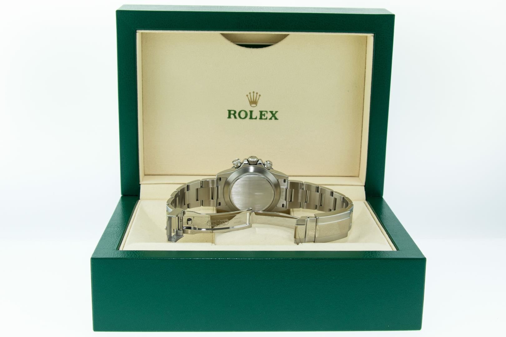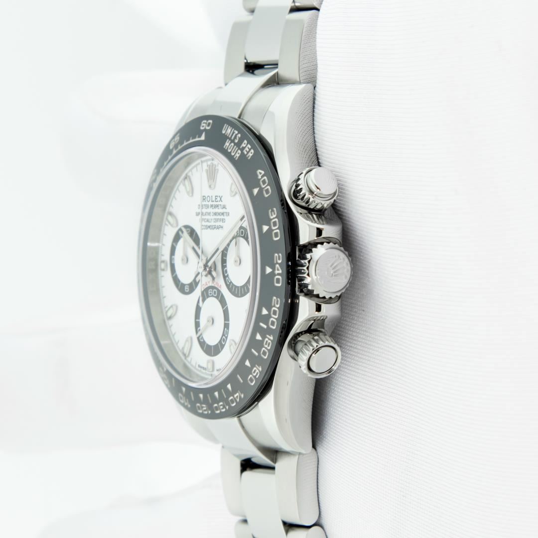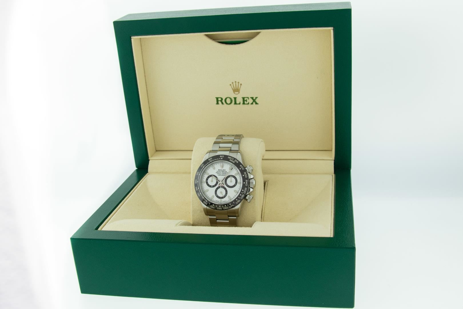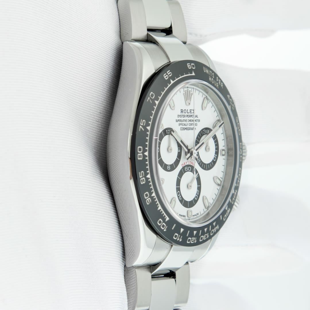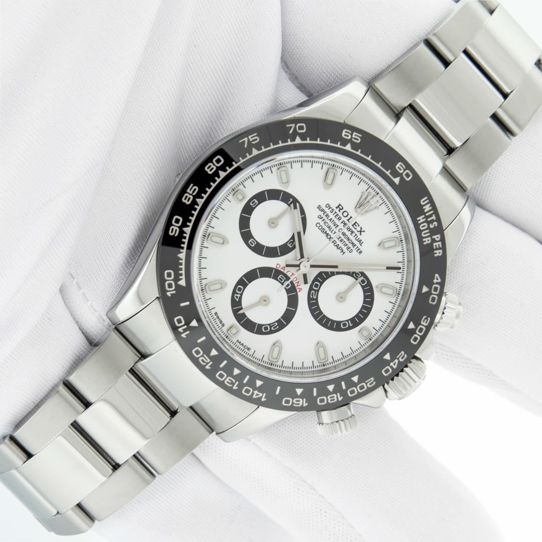 One Mens Pre Owned Rolex Stainless Steel Ceramic Daytona Polished Bright with Satin Finish, This Watch Has Been Serviced & Electronically Tested, Rolex Stainless Steel Case: 40mm, Rolex Bezel: Stainless Steel Bezel With Black Ceramic Insert. Rolex Crystal: Sapphire. Rolex Hands: Daytona Hands. Rolex Movement: Automatic Movement 4130. Rolex Dial: White Daytona Dial. Functions: Time With Running Seconds, 30 Minute Chronograph, 12 Hour Chronograph. Model: 116500 Ceramic Daytona. Condition: G-6 Extra Fine. Rolex Bracelet: Stainless Steel Oyster Band. Bright Polish & Satin Finish. 7.00 Inch Length, Adjustable. Flip Lock Clasp with Rolex Logo. This Watch Has Been Serviced Time Tested And Is In Excellent Condition It Is Free Of All Scratches And Dents. This Watch Comes With A Rolex Box.