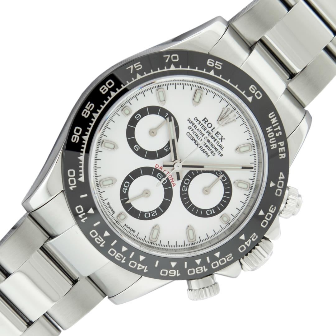 One Mens Pre Owned Rolex Stainless Steel Ceramic Daytona Polished Bright with Satin Finish, This Watch Has Been Serviced & Electronically Tested, Rolex Stainless Steel Case: 40mm, Rolex Bezel: Stainless Steel Bezel With Black Ceramic Insert. Rolex Crystal: Sapphire. Rolex Hands: Daytona Hands. Rolex Movement: Automatic Movement 4130. Rolex Dial: White Daytona Dial. Functions: Time With Running Seconds, 30 Minute Chronograph, 12 Hour Chronograph. Model: 116500 Ceramic Daytona. Condition: G-6 Extra Fine. Rolex Bracelet: Stainless Steel Oyster Band. Bright Polish & Satin Finish. 7.00 Inch Length, Adjustable. Flip Lock Clasp with Rolex Logo. This Watch Has Been Serviced Time Tested And Is In Excellent Condition It Is Free Of All Scratches And Dents. This Watch Comes With A Rolex Box.