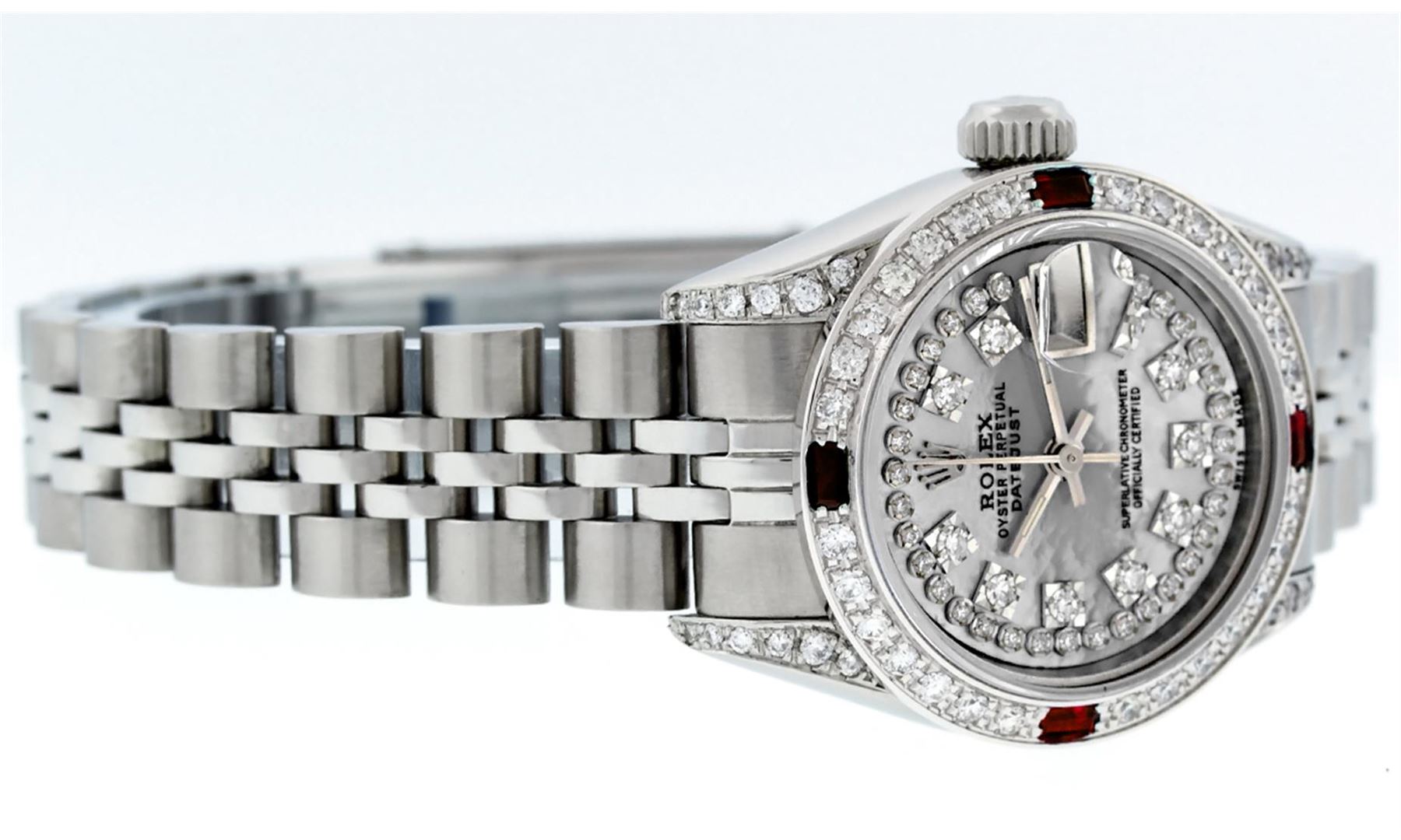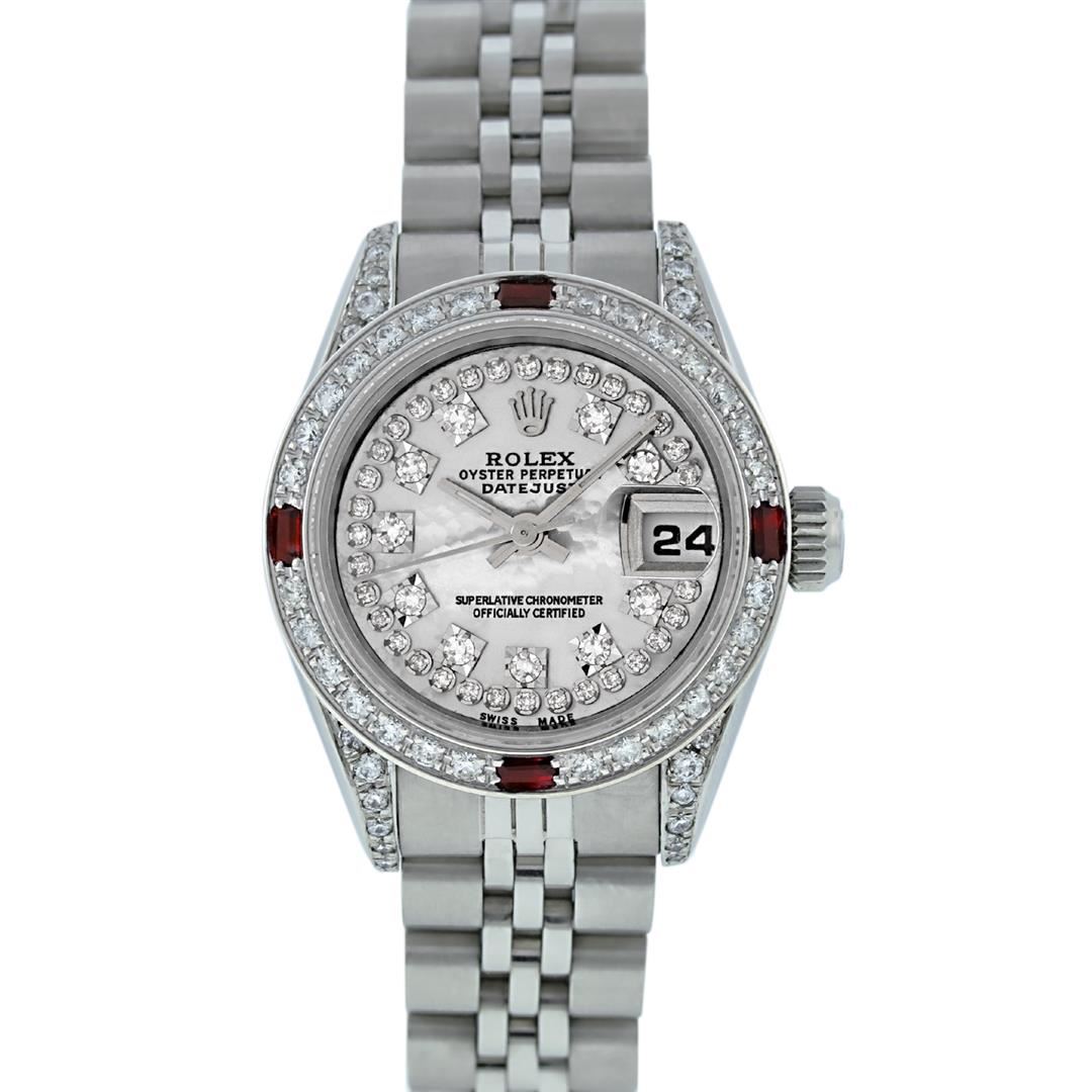One Ladies Rolex Datejust Polished Bright with Satin Finish, Serviced & Electronically Tested, Stainless Steel Case:26mm, Stainless Steel Crown, Diamond Lugs: 16 Diamonds On Lugs, Clarity: SI-VS, Color: G to H. Custom Bezel: 18K White Gold Beadset Ruby Bezel, Diamond Count: 28 Diamonds + 4 Rubies, Total Weight 1.00 Carat, Clarity: SI-VS, Color: G to H. Custom Crystal: Synthetic Sapphire Cyclops Lens. Movement: Automatic Winding Movement Caliber 2235. Custom Dial: Refinished Mother Of Pearl String Diamond Dial VS, 43 Diamonds in Dial G To H In Color, Clarity: VS. Date Window: 3 O'Clock Position Date Display, Model: No Hole Datejust Quickset. Condition: G-6 Extra Fine. Bracelet: Stainless Steel Jubilee Band. Bright Polish & Satin Finish. 6.0 Inch Length, Adjustable. Standard Clasp, With Rolex Logo.