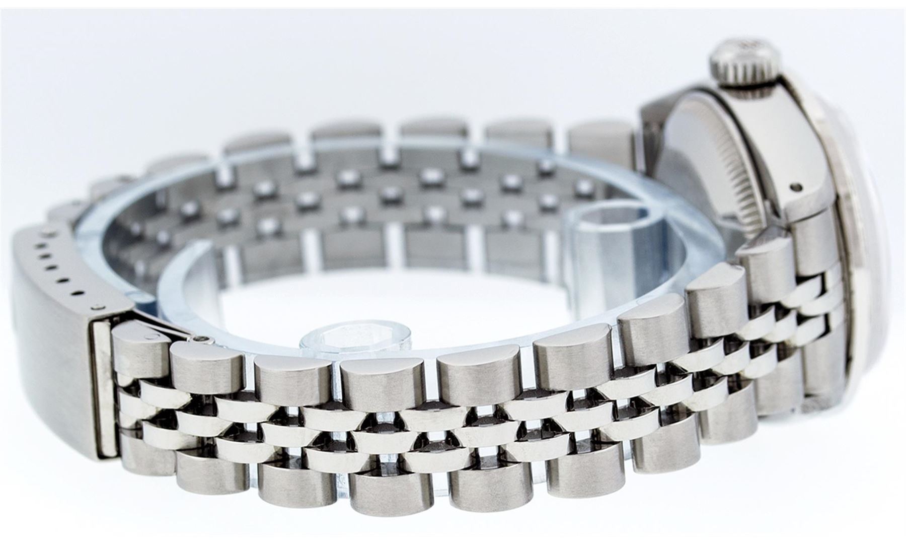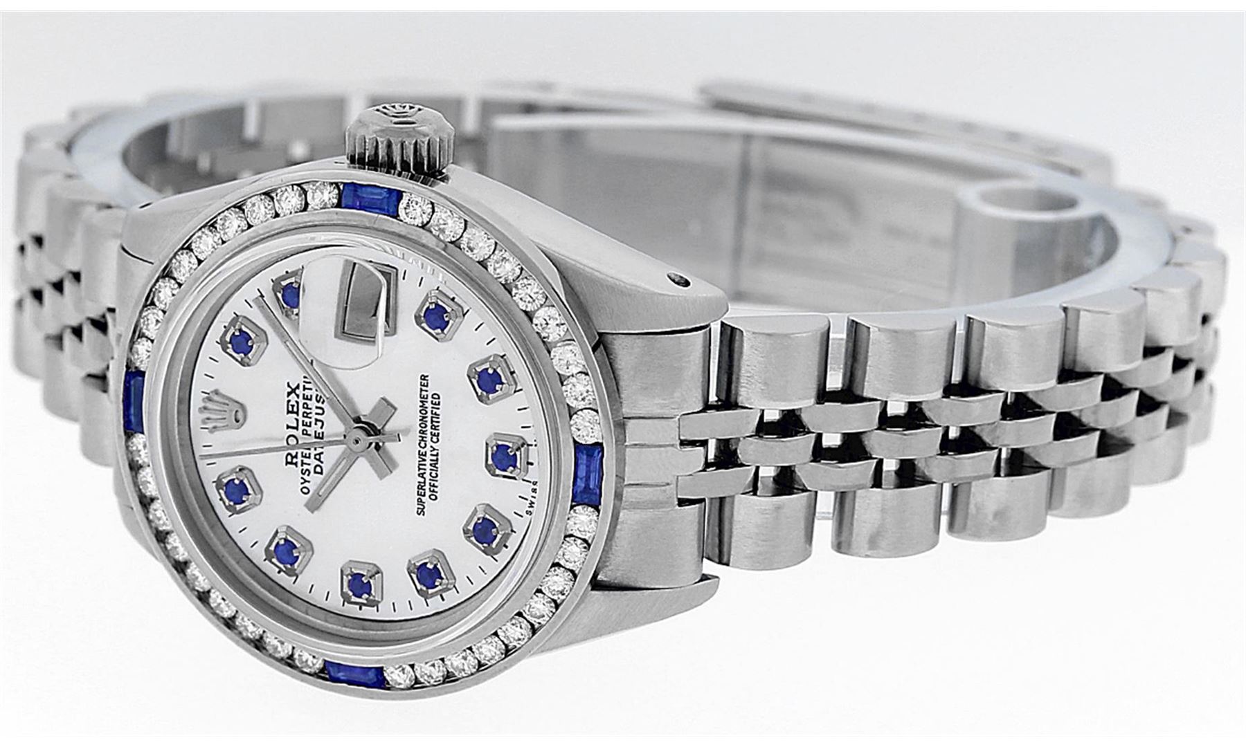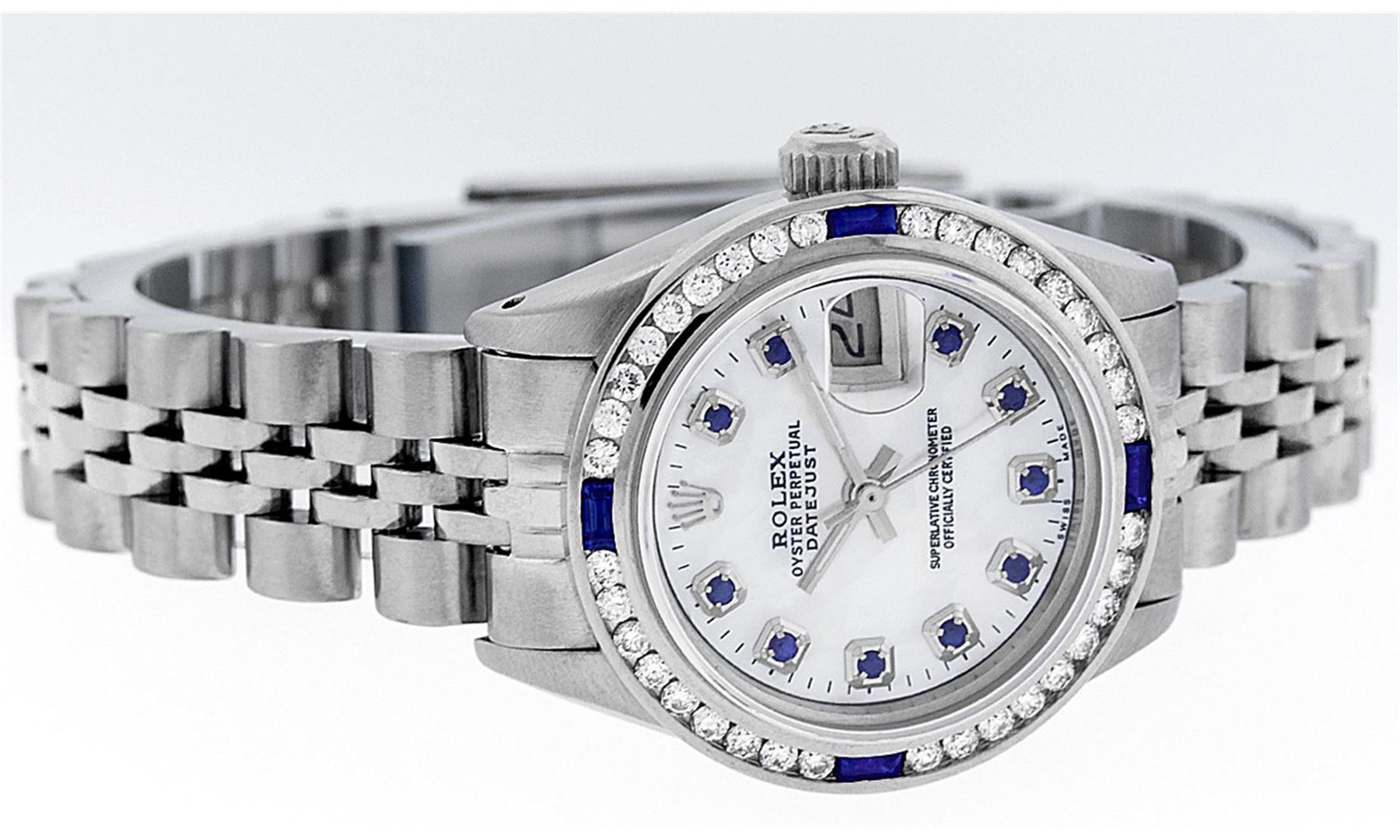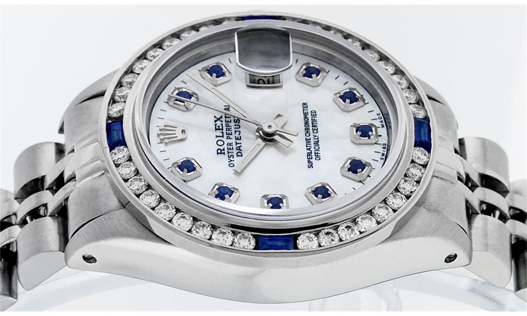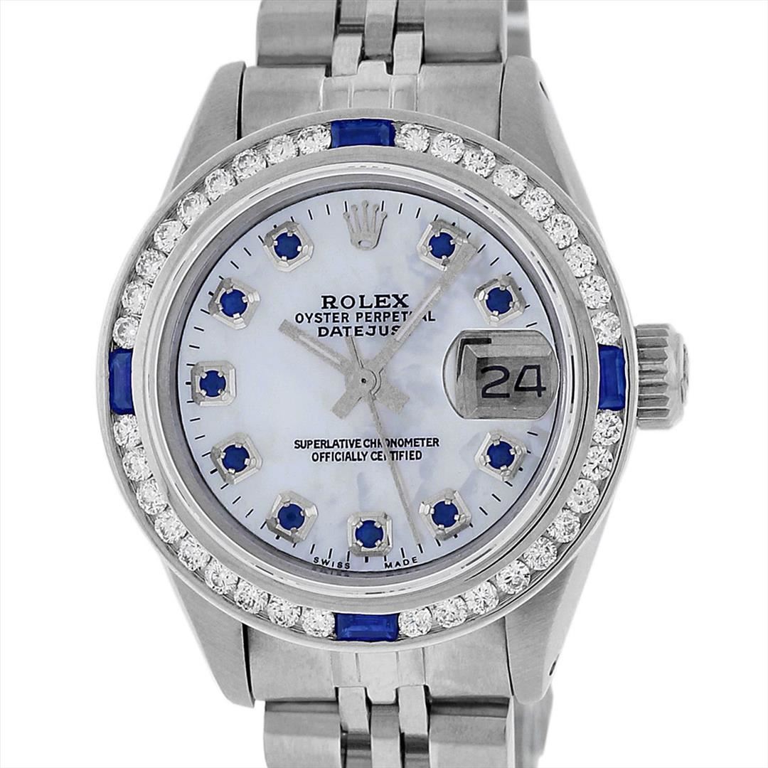 One Ladies Rolex Datejust Polished Bright with Satin Finish, Serviced & Electronically Tested, Stainless Steel Case:26mm, Stainless Steel Crown, Custom Bezel: 18K White Gold Sapphire Channel Set Diamond Bezel, Diamond + Gem Count: 36 Diamonds + 4 Sapphire Total Weight 1.00 Carat, Clarity: SI-VS, Color: G to H. Custom Crystal: Synthetic Sapphire Cyclops Lens. Movement: Automatic Winding Movement Caliber 2030. Custom Dial: Mother Of Pearl With Sapphire Hour Markers, Stone Count: 10 Sapphires In Dial. Date Window: 3 O'Clock Position Date Display, Model: Datejust, Condition: G-6 Extra Fine. Bracelet: Stainless Steel Jubilee. Bright Polish & Satin Finish. 6.0 Inch Length, Adjustable. Standard Clasp, With Rolex Logo.