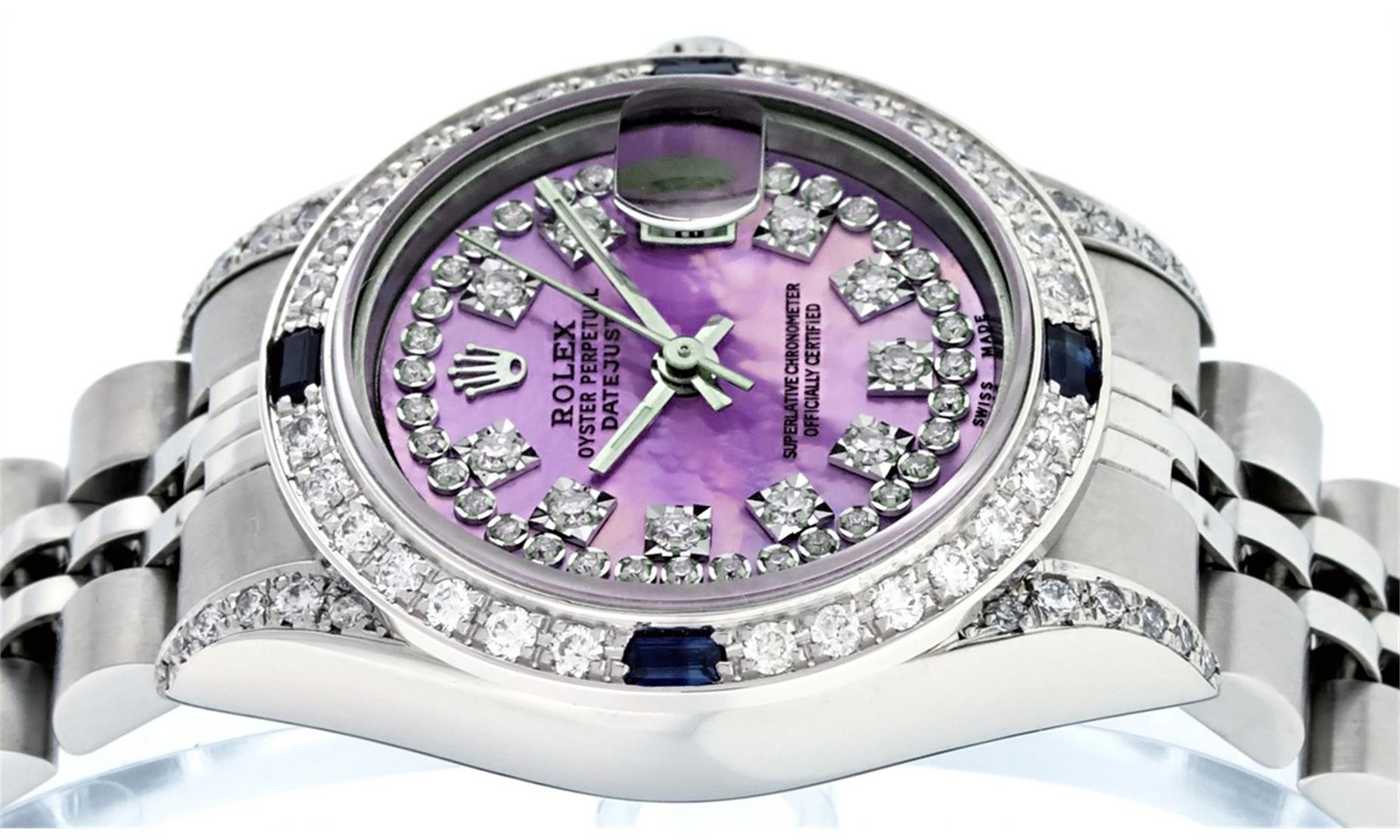 One Ladies Rolex Datejust Polished Bright with Satin Finish, Serviced & Electronically Tested, Stainless Steel Case:26mm, Stainless Steel Crown, Diamond Lugs: 16 Diamonds On Lugs, Clarity: SI-VS, Color: G to H. Custom Bezel: 18K White Gold Beadset Sapphire Bezel, Diamond Count: 28 Diamonds + 4 Sapphires, Total Weight 1.00 Carat, Clarity: SI-VS, Color: G to H. Custom Crystal: Synthetic Sapphire Cyclops Lens. Movement: Automatic Winding Movement Caliber 2235. Custom Dial: Refinished Purple Mother Of Pearl String Diamond Dial VS, 43 Diamonds in Dial G To H In Color, Clarity: VS. Date Window: 3 O'Clock Position Date Display, Model: No Hole Datejust Quickset. Condition: G-6 Extra Fine. Bracelet: Stainless Steel Jubilee Band. Bright Polish & Satin Finish. 6.0 Inch Length, Adjustable. Standard Clasp, With Rolex Logo.