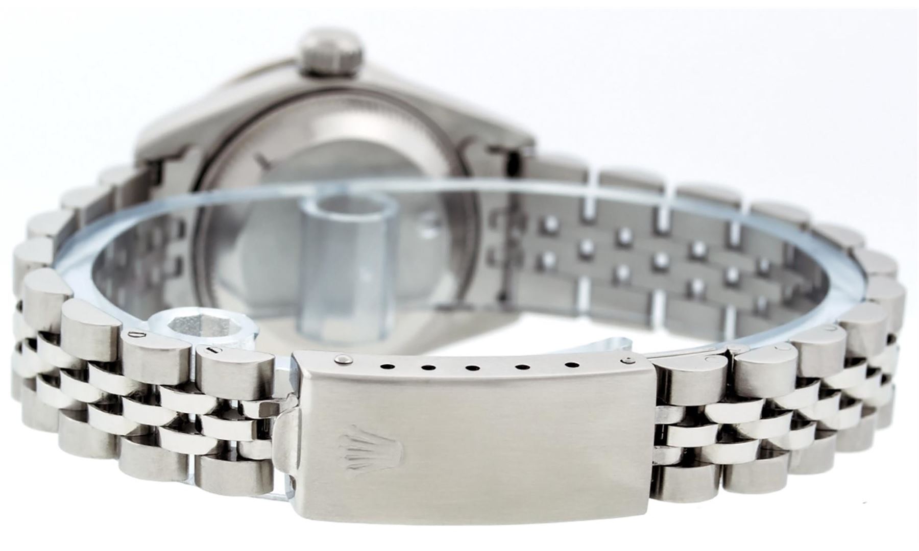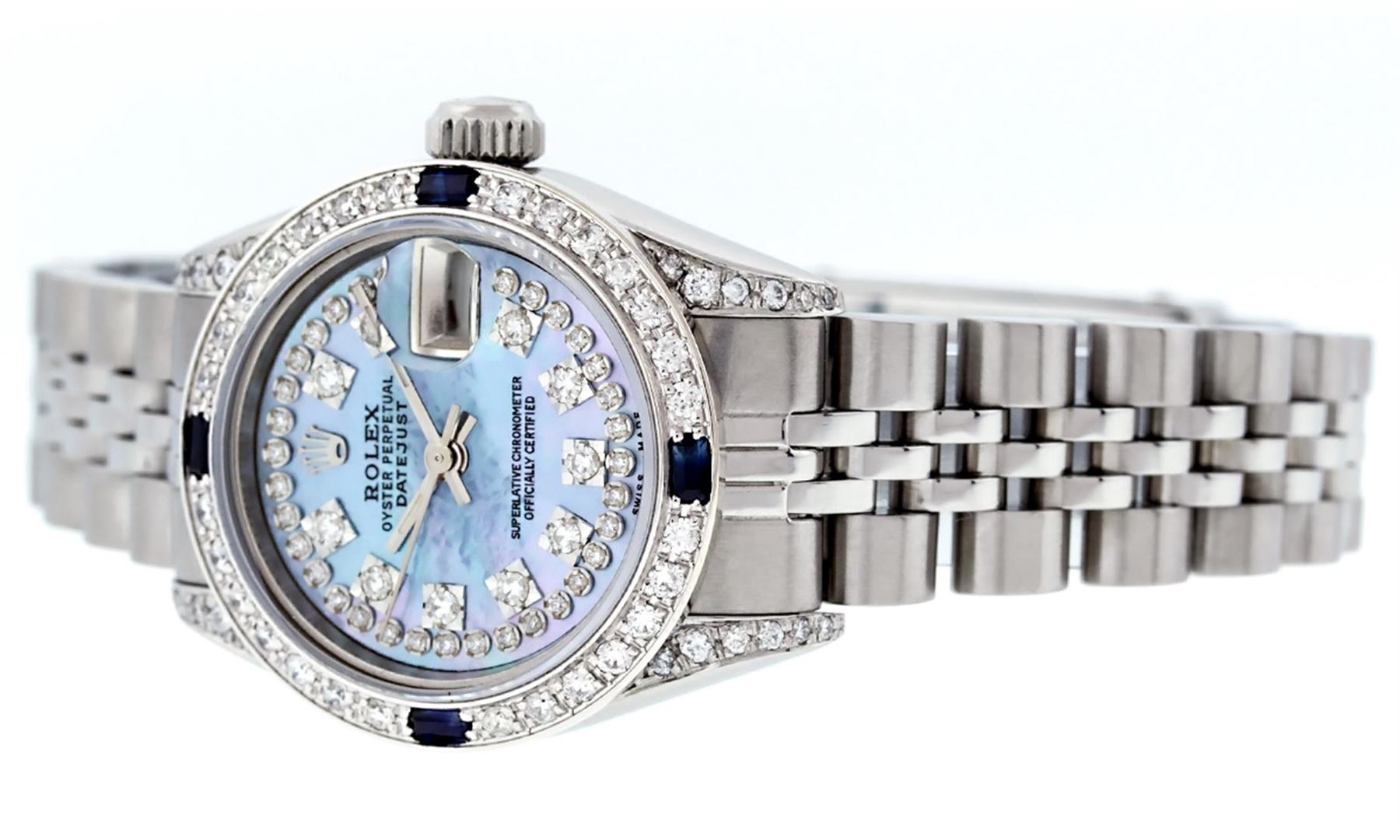 One Ladies Rolex Datejust Polished Bright with Satin Finish, Serviced & Electronically Tested, Stainless Steel Case:26mm, Stainless Steel Crown, Diamond Lugs: 16 Diamonds On Lugs, Clarity: SI-VS, Color: G to H. Custom Bezel: 18K White Gold Beadset Sapphire Bezel, Diamond Count: 28 Diamonds + 4 Sapphires, Total Weight 1.00 Carat, Clarity: SI-VS, Color: G to H. Custom Crystal: Synthetic Sapphire Cyclops Lens. Movement: Automatic Winding Movement Caliber 2235. Custom Dial: Refinished Blue Mother Of Pearl String Diamond Dial VS, 43 Diamonds in Dial G To H In Color, Clarity: VVS. Date Window: 3 O'Clock Position Date Display, Model: No Hole Datejust Quickset. Condition: G-6 Extra Fine. Bracelet: Stainless Steel Jubilee Band. Bright Polish & Satin Finish. 6.0 Inch Length, Adjustable. Standard Clasp, With Rolex Logo.