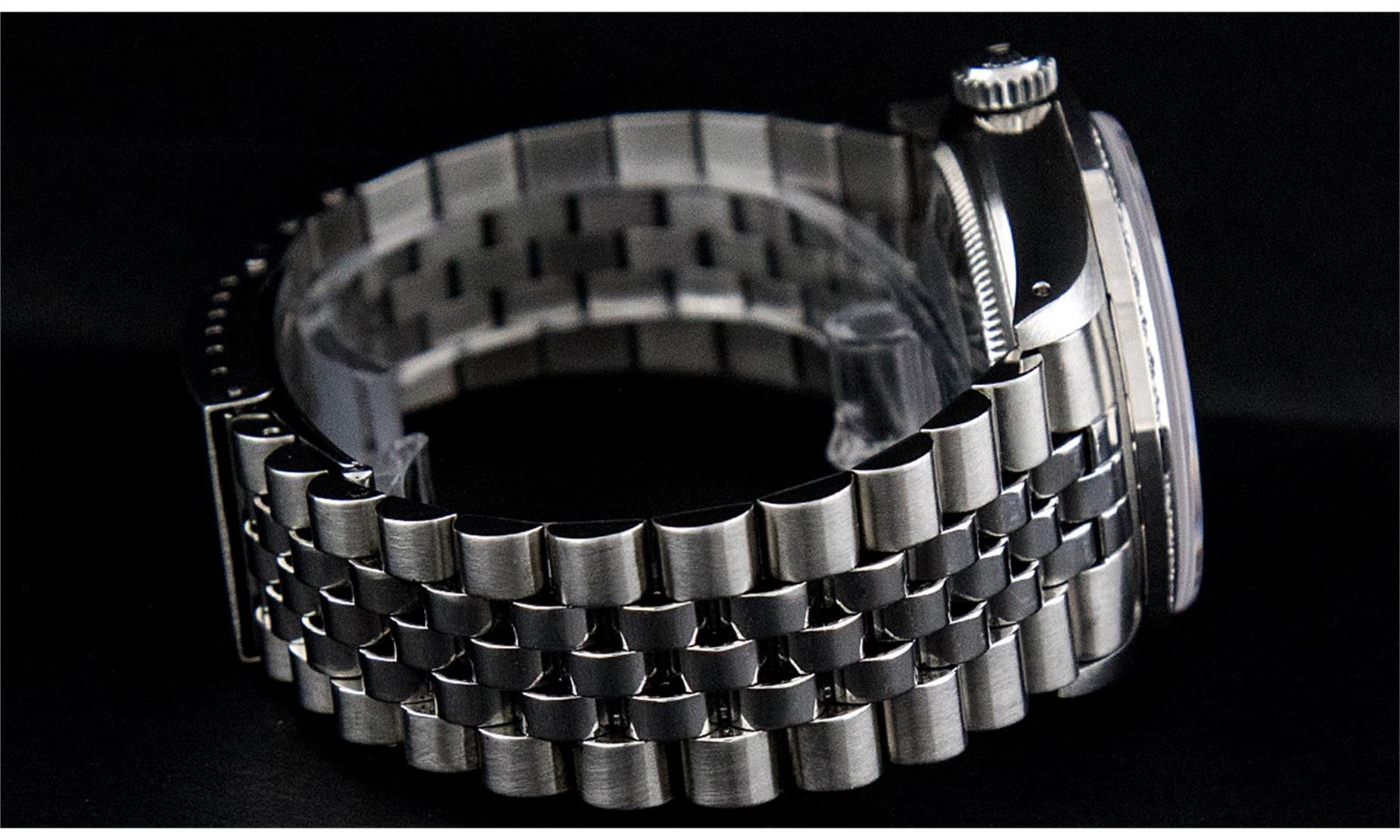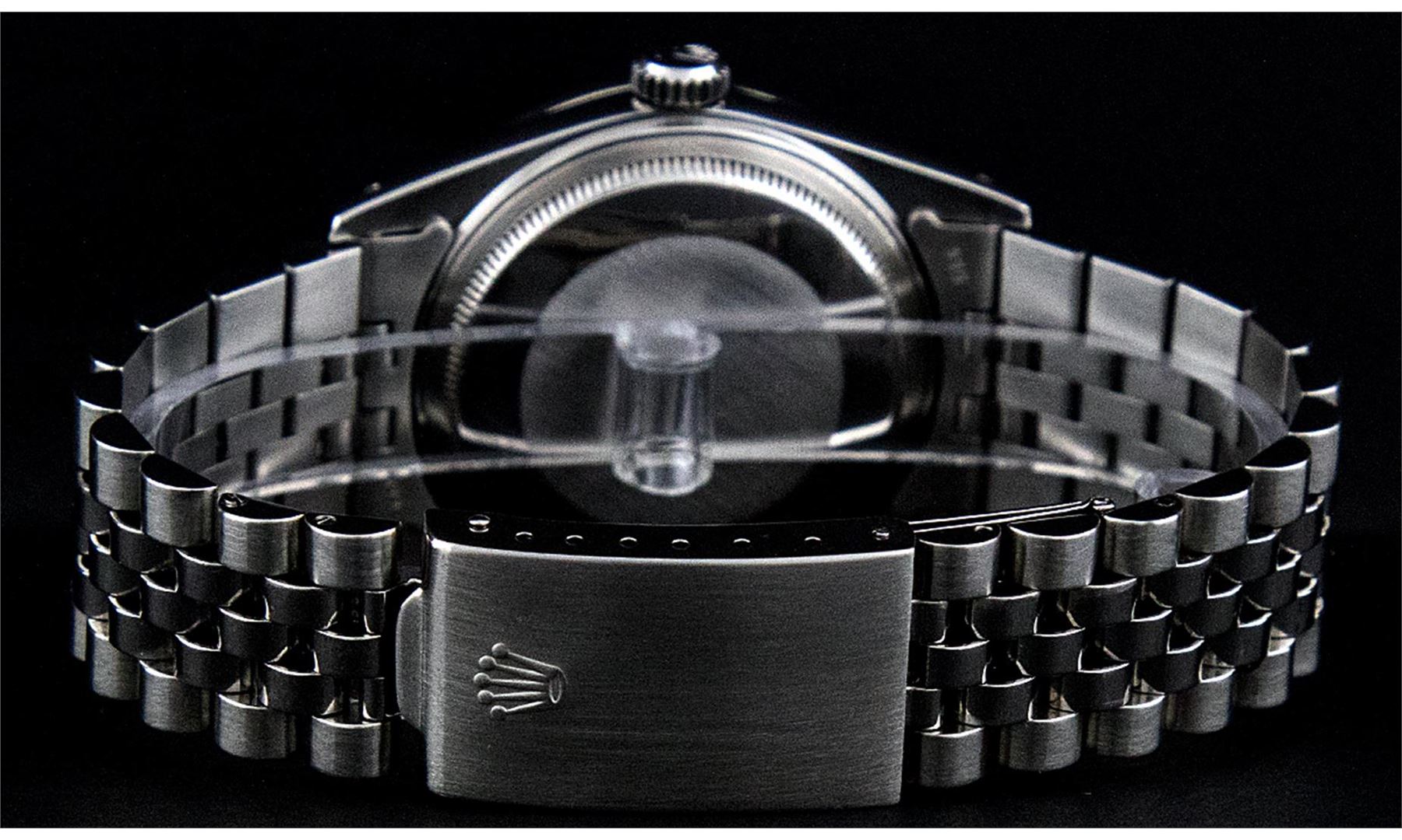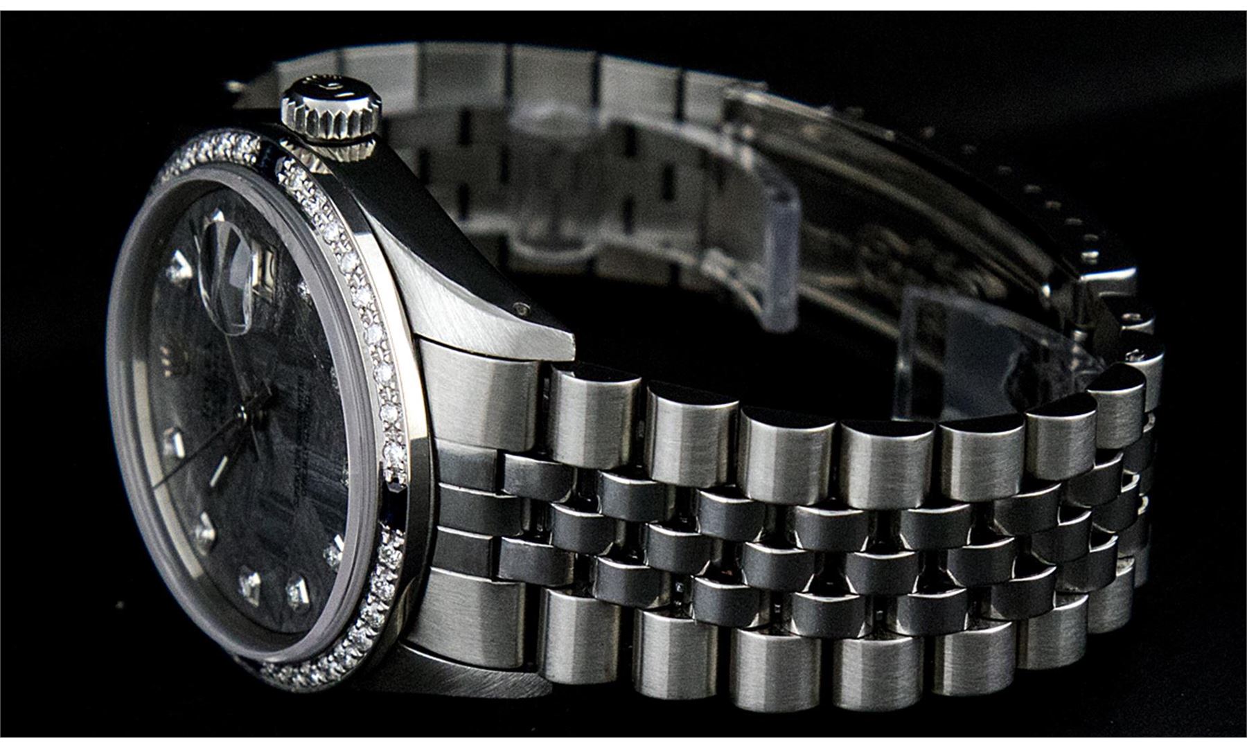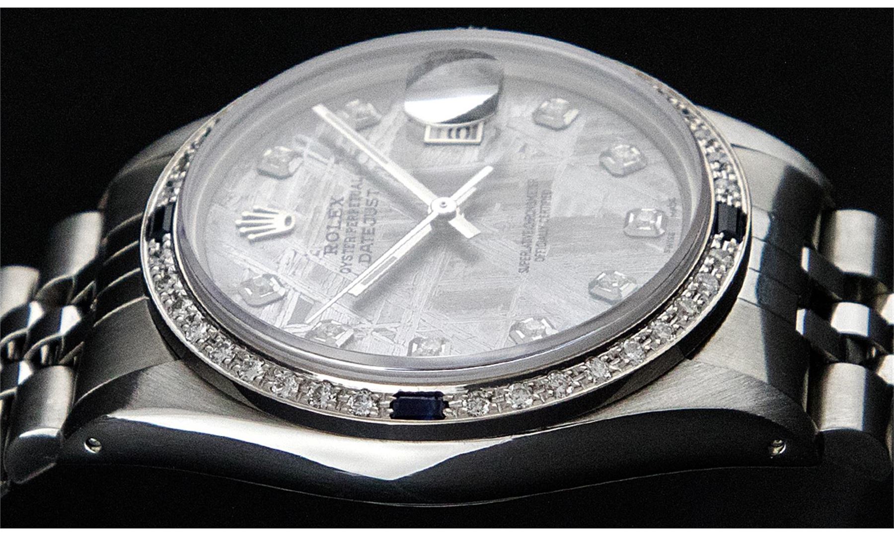 One Mens Stainless Steel Rolex Datejust Polished Bright with Satin Finish, Fully Serviced & Electronically Tested, Stainless Steel Case:36mm, Stainless Steel Crown, Custom Bezel: 18K White Gold Sapphire Beadset Diamond Bezel, Diamond Count: 36 Diamonds + 4 Sapphire, Total Weight 1.00 Carat, Clarity: SI-VS, Color: G to H. Custom Crystal: Synthetic Sapphire Cyclops Lens. Movement: Automatic Winding Movement Caliber 3135. Custom Dial: Meteorite Diamond Dial, 10 Diamonds in Dial, G To H In Color, Clarity: SI-VS. Date Window: 3 O'Clock Position Date Display, Quickset, Model: 16234 Sapphire Datejust, Condition: G-6 Extra Fine. Bracelet: Stainless Steel Jubilee. Bright Polish & Satin Finish. 7.0 Inch Length, Adjustable. Standard Clasp, With Rolex Logo.