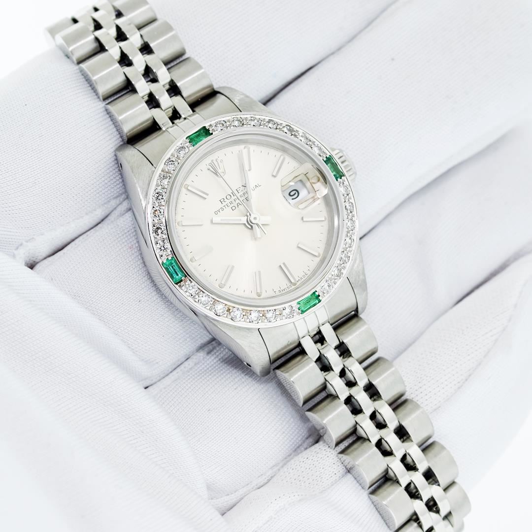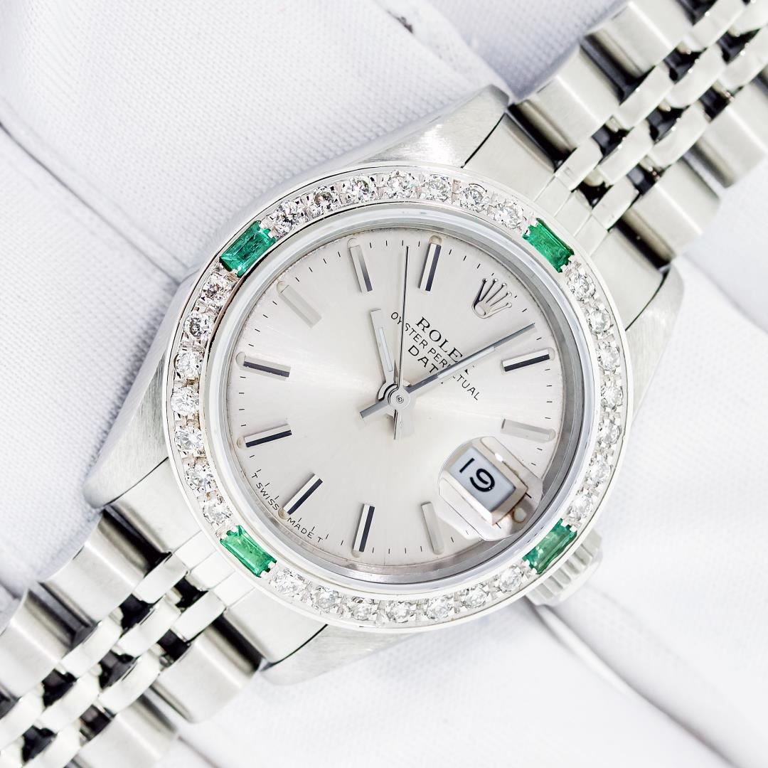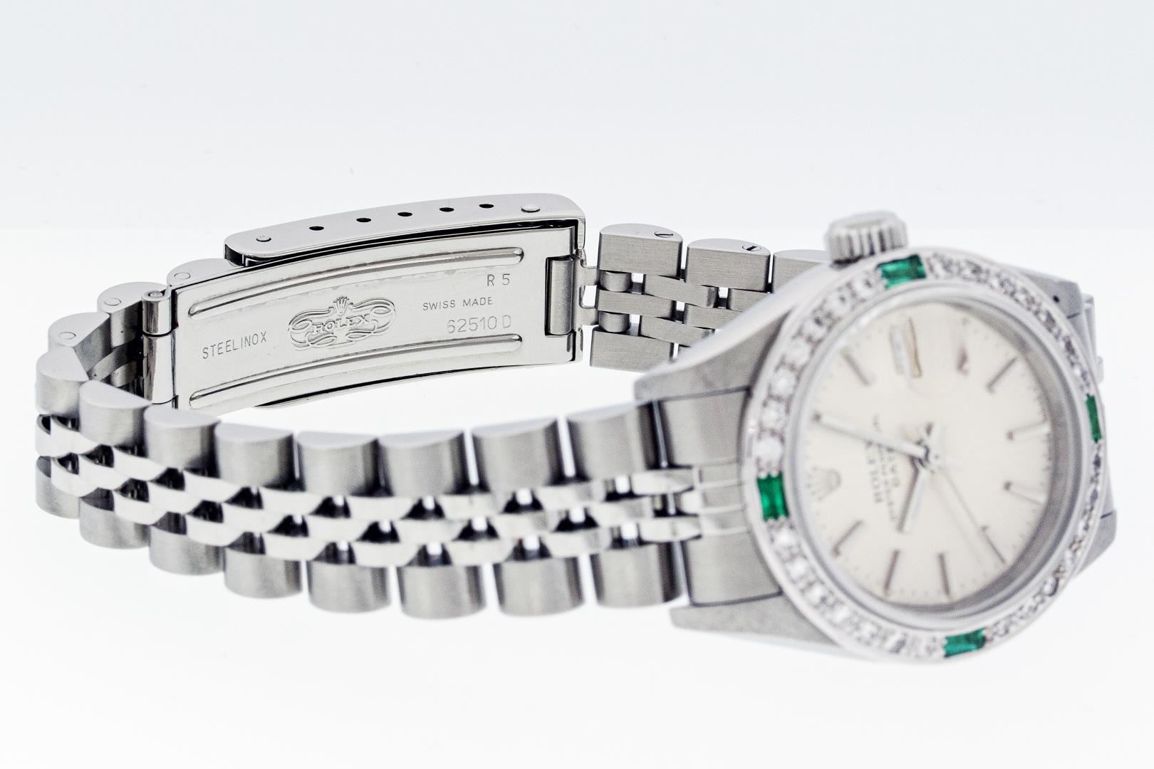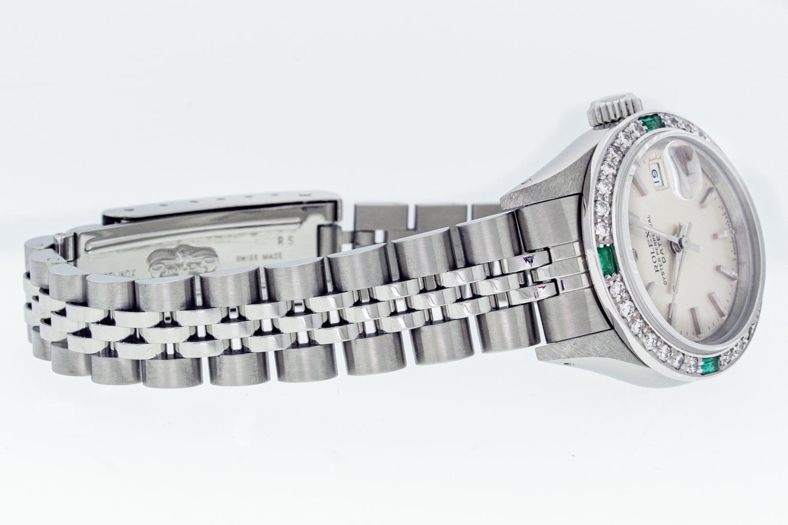 One Ladies Pre Owned Quickset Stainless Steel Rolex Date Polished Bright with Satin Finish Serviced & Electronically Tested, Rolex Stainless Steel Case: 26mm, Rolex Stainless Steel Crown, Custom Bezel: New White Gold Beadset + Emerald Diamond Bezel, Diamond Count: 28 Diamonds + 4 Emeralds. Custom Crystal: New Sapphire With Date Window. Custom Hands: New Luminescent Hands. Rolex Movement: Automatic Winding Movement. Rolex Dial: Silver Index Dial With Dash Track And Lumi Dot. Date Window: 3 O'Clock Position Date Display, Model: Datejust. Condition: G-6 Extra Fine. Rolex Bracelet: Stainless Steel Jubilee Band With Rolex Crown On Buckle. Bright Polish & Satin Finish. Band Length: 6.0 Inch Length, Adjustable. Standard Clasp, With Rolex Logo. This Watch Has Been Serviced Time Tested And Is In Excellent Condition It Is Free Of All Scratches And Dents.