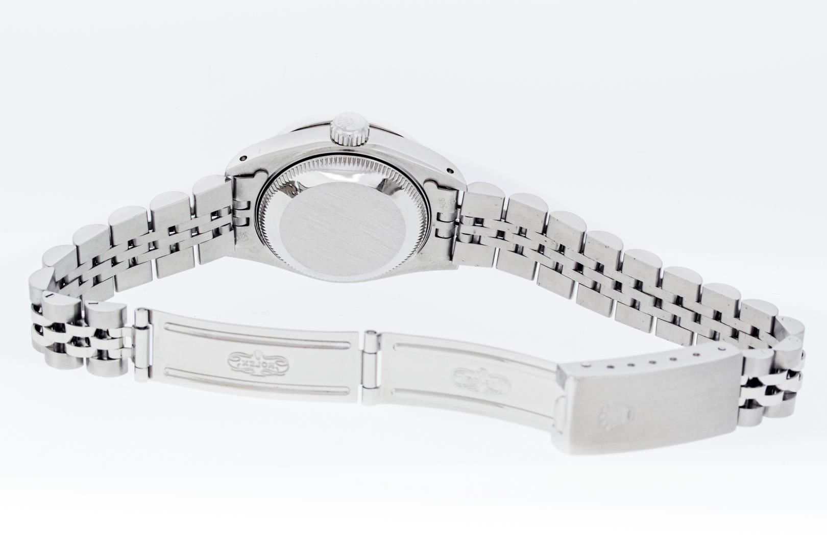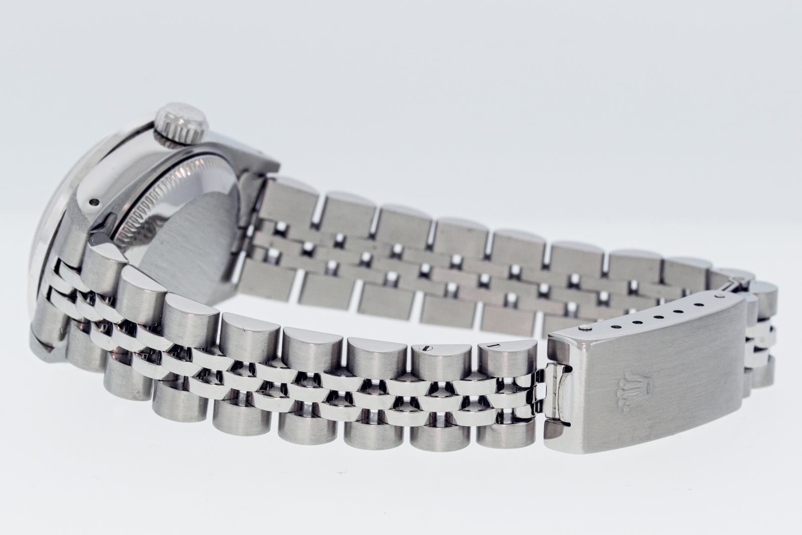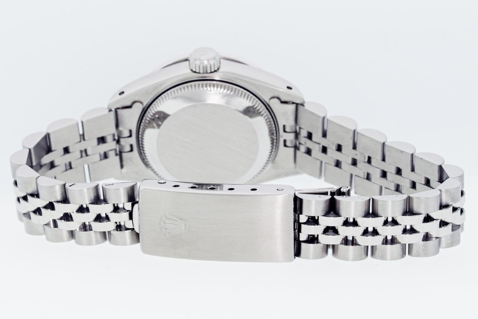 One Ladies Pre Owned Quickset Stainless Steel Rolex Date Polished Bright with Satin Finish Serviced & Electronically Tested, Rolex Stainless Steel Case: 26mm, Rolex Stainless Steel Crown, Custom Bezel: New White Gold Beadset + Emerald Diamond Bezel, Diamond Count: 28 Diamonds + 4 Emeralds. Custom Crystal: New Sapphire With Date Window. Custom Hands: New Luminescent Hands. Rolex Movement: Automatic Winding Movement. Rolex Dial: Silver Index Dial With Dash Track And Lumi Dot. Date Window: 3 O'Clock Position Date Display, Model: Datejust. Condition: G-6 Extra Fine. Rolex Bracelet: Stainless Steel Jubilee Band With Rolex Crown On Buckle. Bright Polish & Satin Finish. Band Length: 6.0 Inch Length, Adjustable. Standard Clasp, With Rolex Logo. This Watch Has Been Serviced Time Tested And Is In Excellent Condition It Is Free Of All Scratches And Dents.