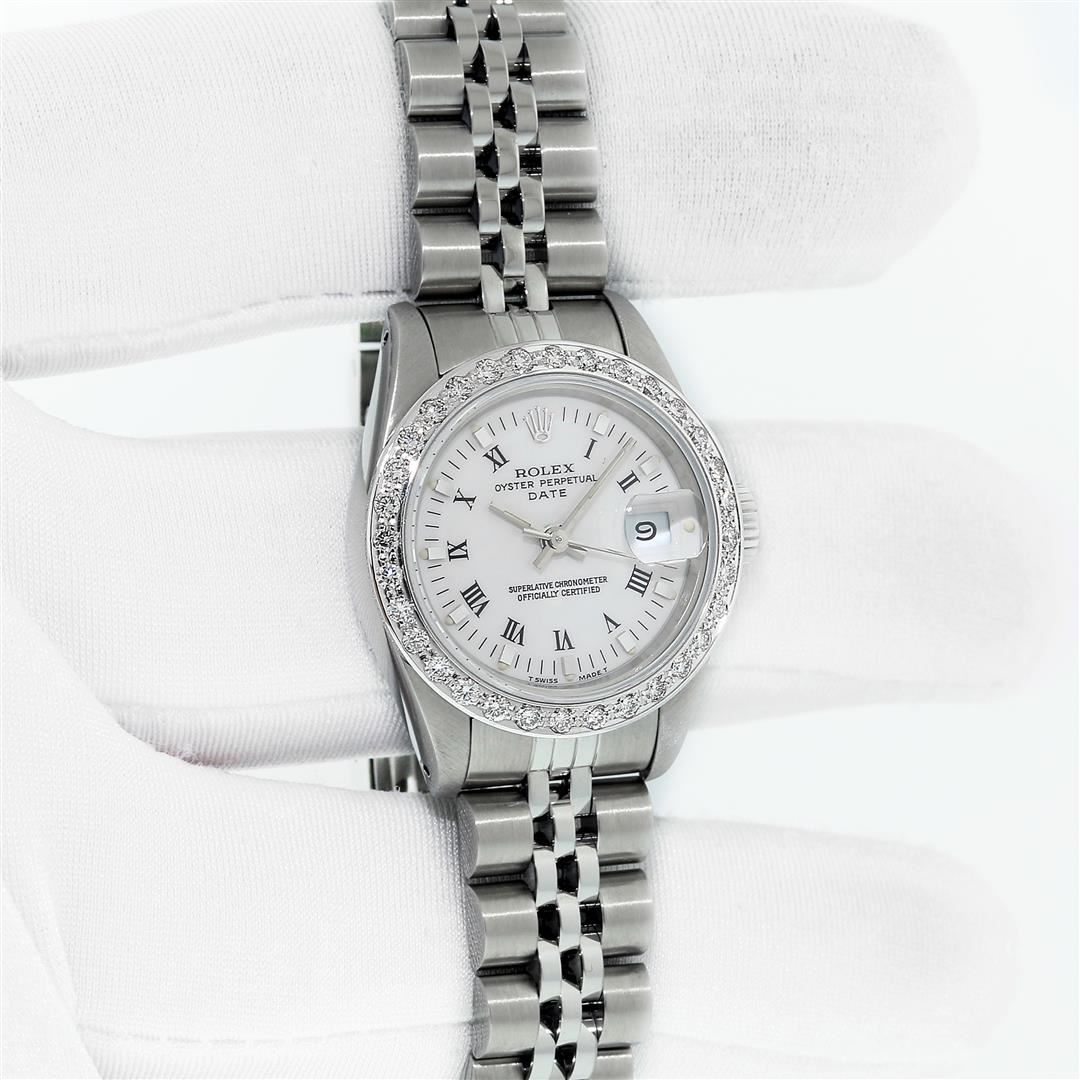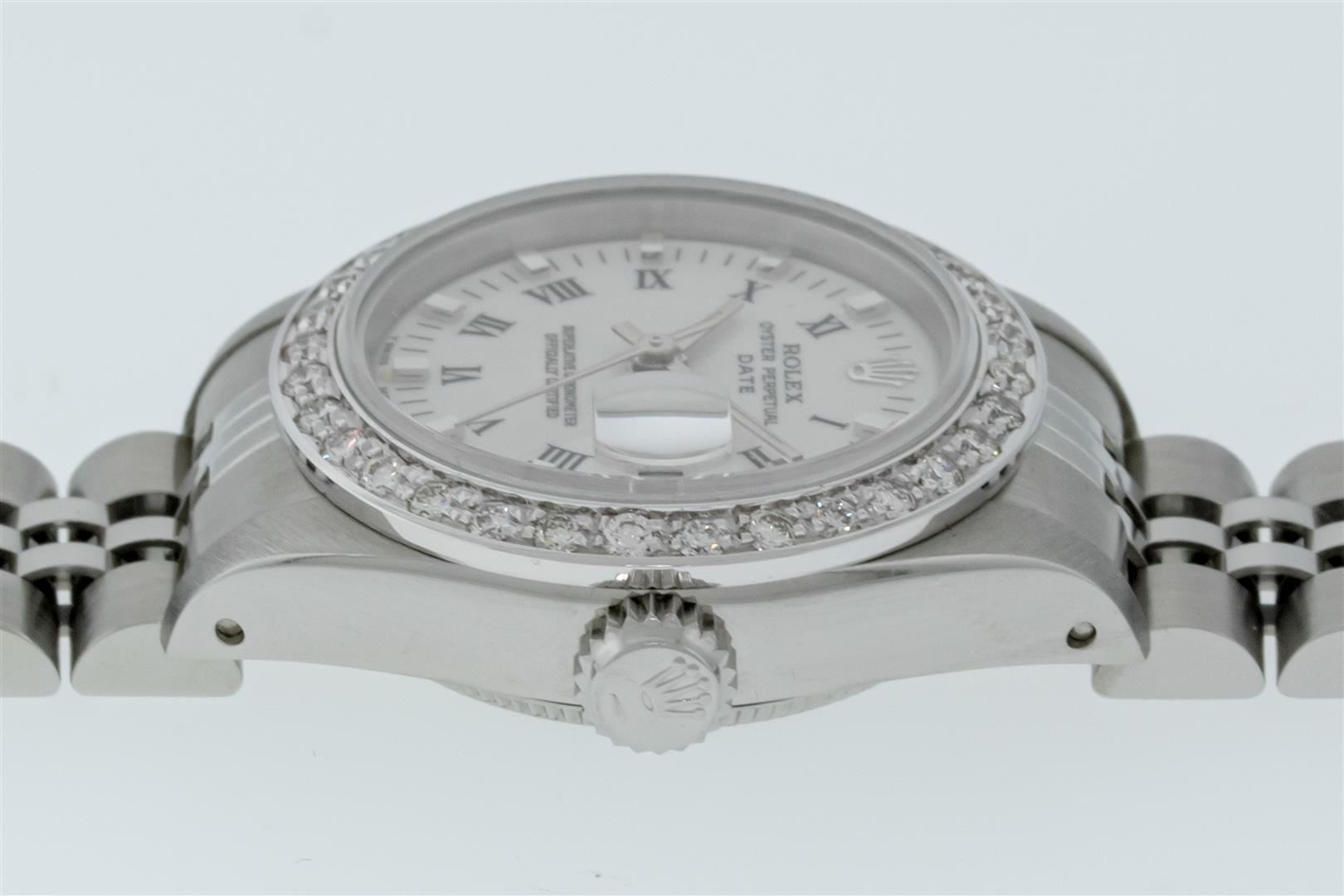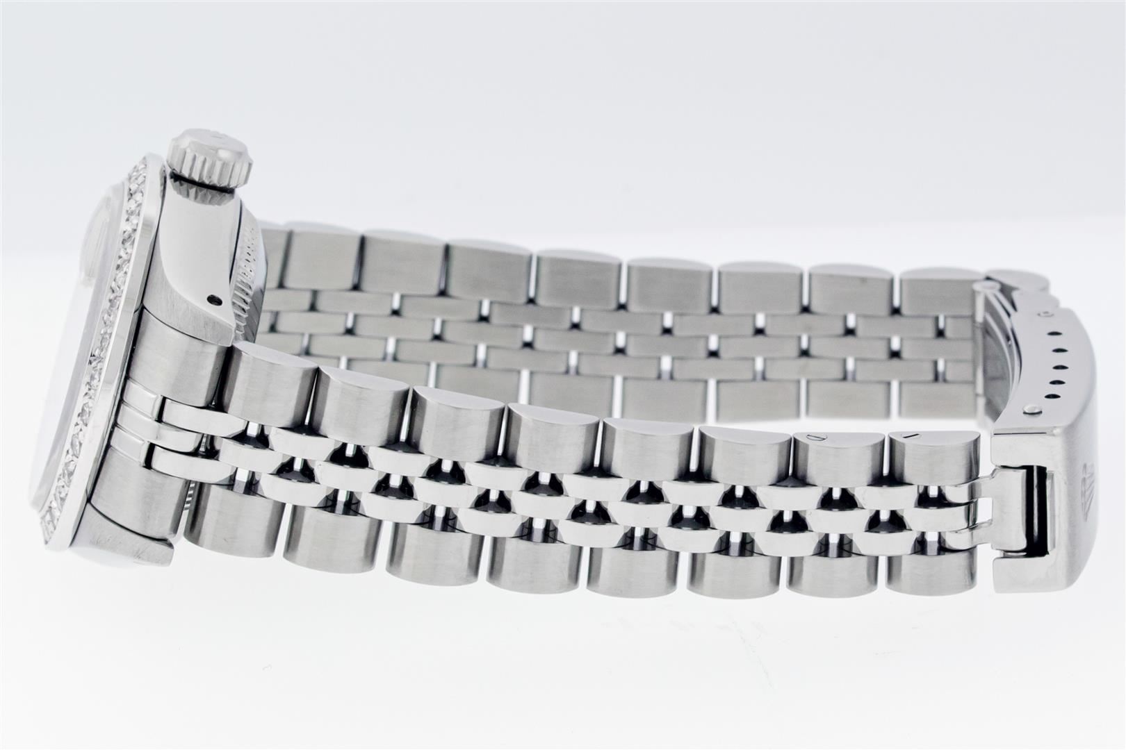 One Ladies Stainless Steel Rolex Datejust Polished Bright with Satin Finish, Serviced & Electronically Tested, Stainless Steel Case: 26mm, Stainless Steel Crown, Custom Bezel: New 18K White Gold Beadset Diamond Bezel, Diamond Count: 32 Diamonds, Total Weight .70 Carat, Clarity: SI-VS, Color: G to H. Custom Crystal: New Scratch Resistant Synthetic Sapphire Cyclops Lens. Custom Hands: New Luminescent Hands. Movement: Automatic Winding Movement. Dial: White Roman Dial With Index Hour Markers And Lumi Dots. Date Window: 3 O'Clock Position Date Display, Model: Datejust. Condition: G-6 Extra Fine. Bracelet: Stainless Steel Jubilee Band. Bright Polish & Satin Finish. 6.0 Inch Length, Adjustable. Standard Clasp, With Rolex Logo. This Watch Has Been Serviced Time Tested And Is In Excellent Condition It Is Free Of All Scratches And Dents.