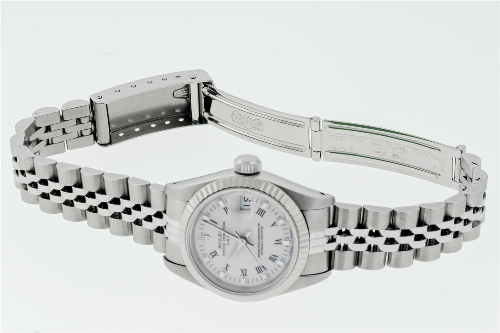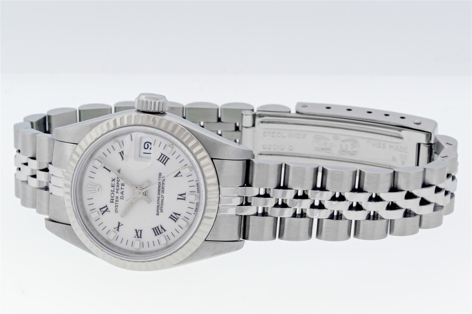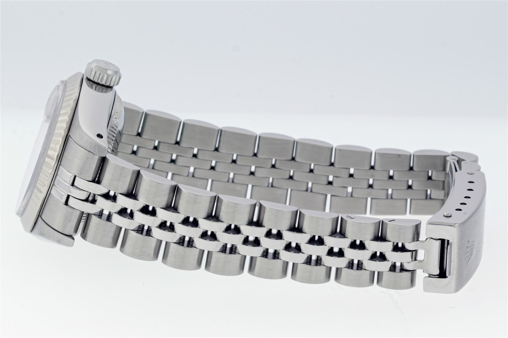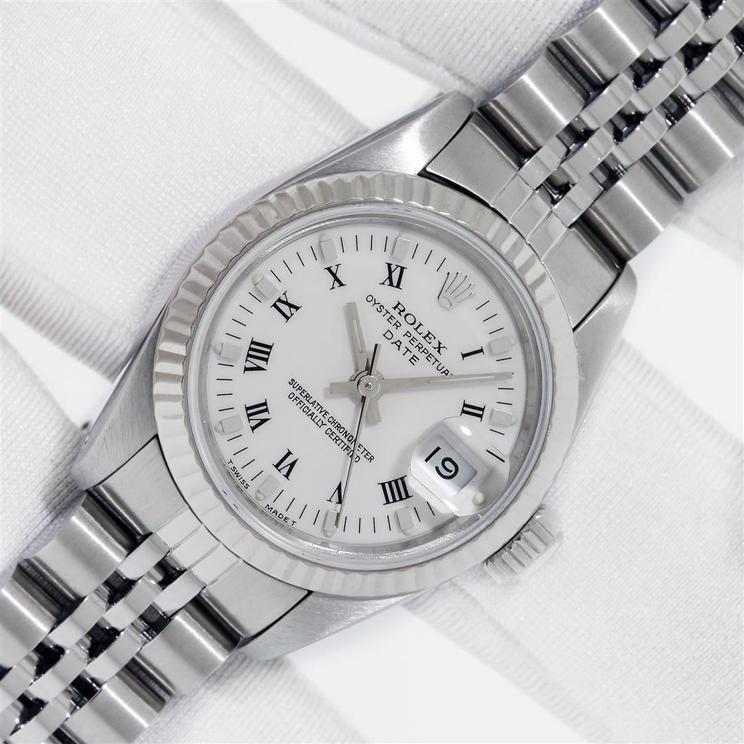 One Ladies Stainless Steel Rolex Datejust Polished Bright with Satin Finish, Serviced & Electronically Tested, Stainless Steel Case: 26mm, Stainless Steel Crown, Bezel: White Gold Fluted Bezel, Custom Crystal: New With Magnifying Date Window. Hands: Lumin
