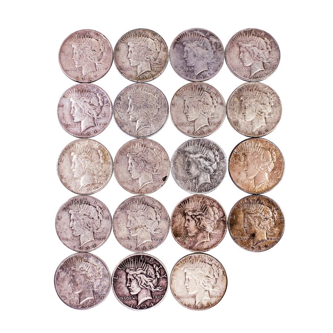 One Roll of (19) 1934-S $1 Peace Silver Dollar Coins Circulated.