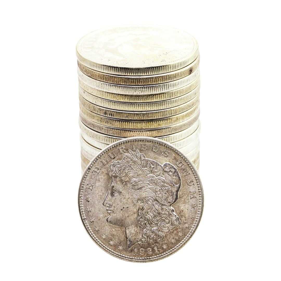 One Roll of (20) 1921-D $1 Morgan Silver Dollar Coins.