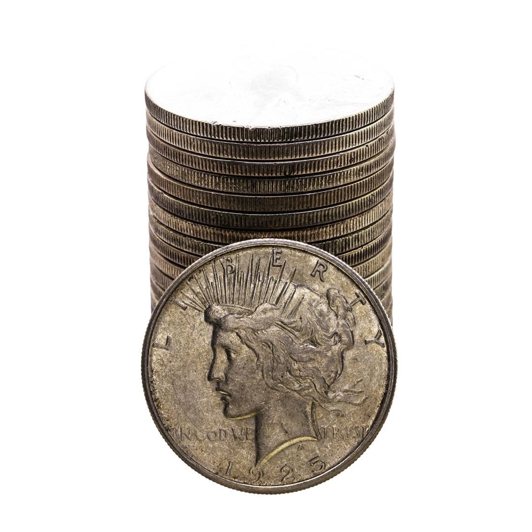 One Roll of (20) 1925-S $1 Peace Silver Dollar Coins Circulated.