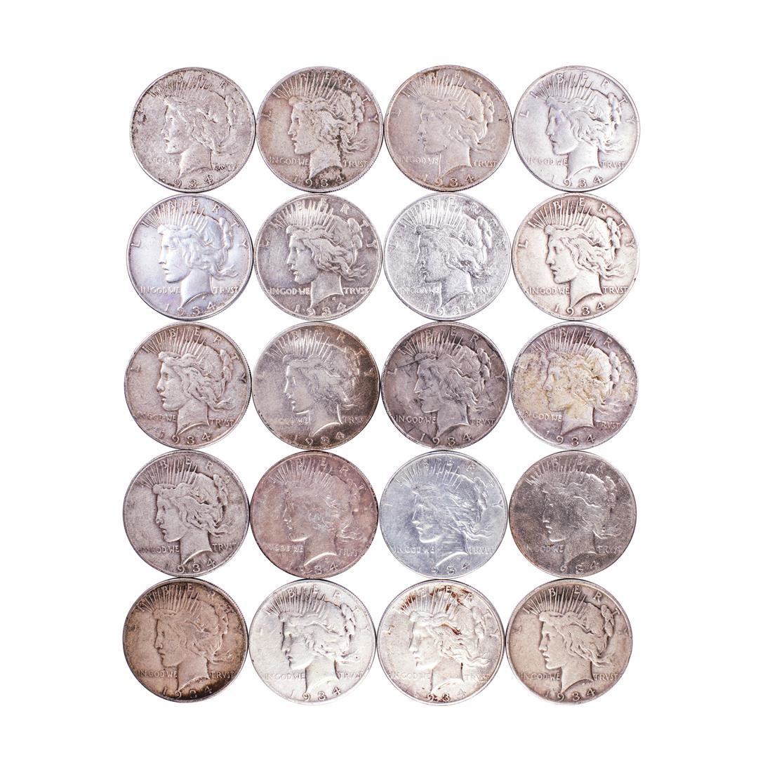 One Roll of (20) 1934-D/S $1 Peace Silver Dollar Coins.