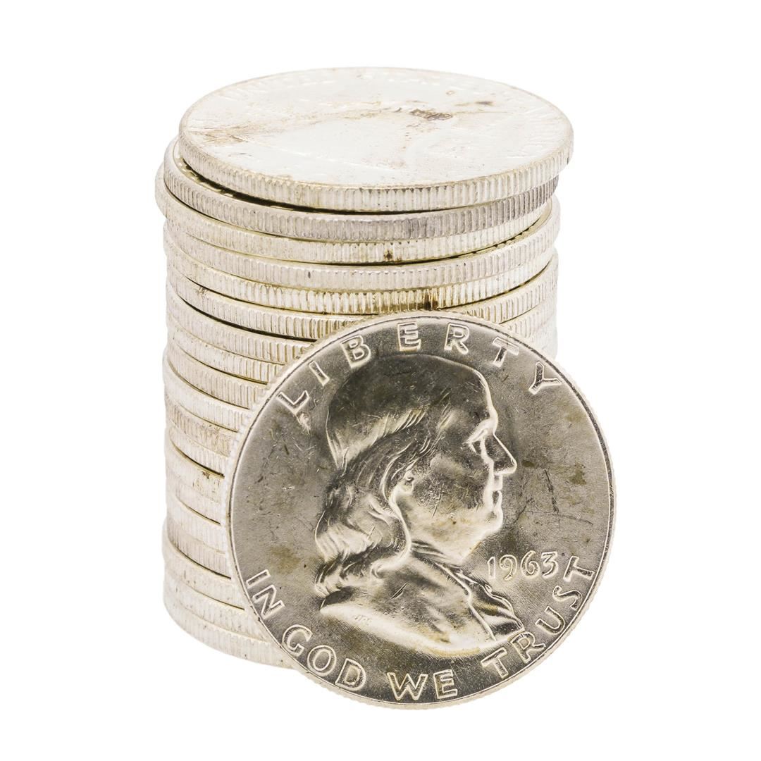 One Roll of (20) 1963-D Brilliant Uncirculated Franklin Half Dollar Coins.