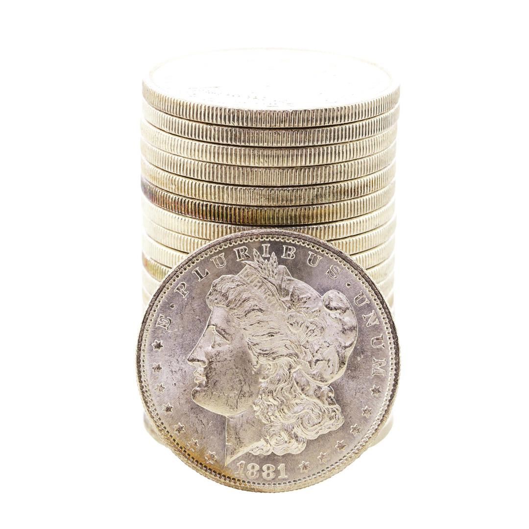 One Roll of (20) Brilliant Uncirculated 1881-S $1 Morgan Silver Dollar Coins Nice Toning.