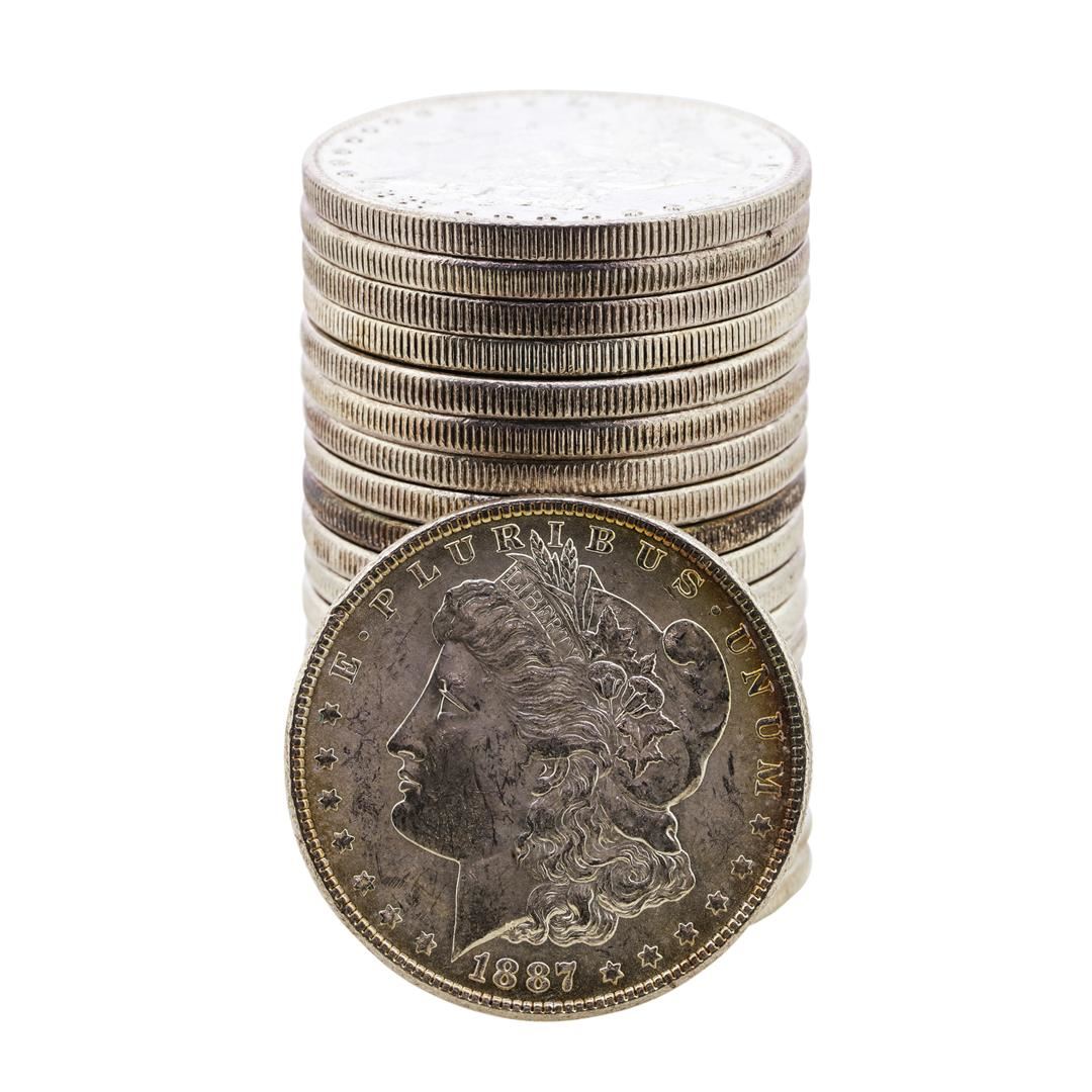 One Roll of (20) Brilliant Uncirculated 1887 $1 Morgan Silver Dollar Coins.