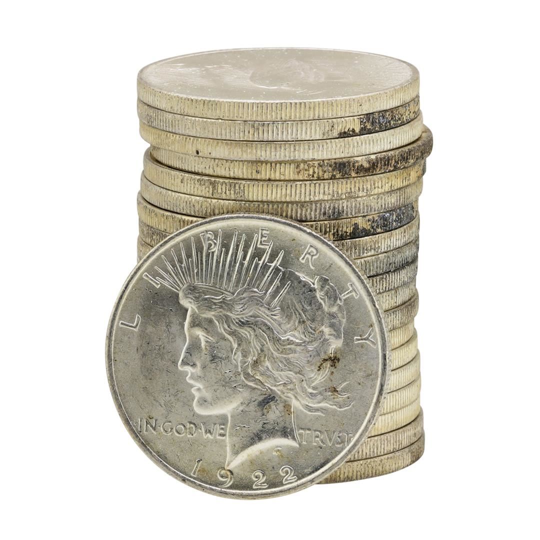 Roll of (20) Brilliant Uncirculated 1922 $1 Peace Silver Dollar Coins