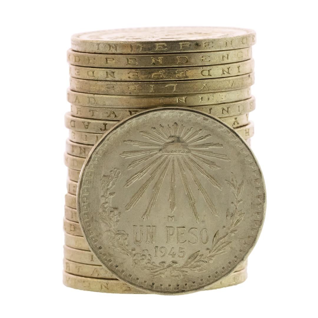 Roll of (20) Brilliant Uncirculated 1945 Mexico Un Peso Silver Coins