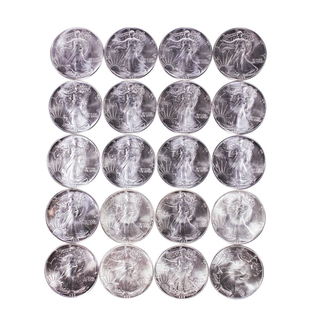 One Roll of (20) Brilliant Uncirculated 1986 $1 American Silver Eagle Coins.