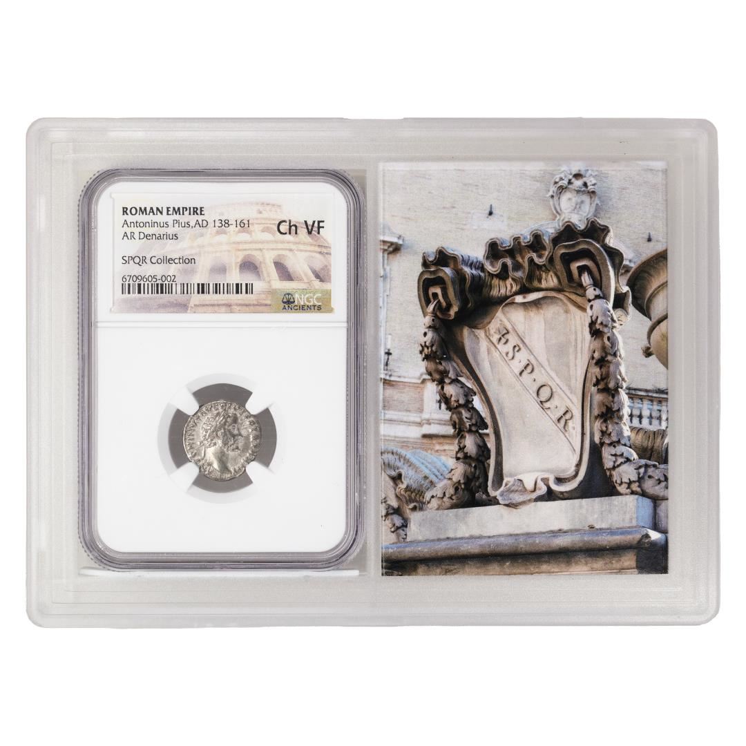 One Roman Empire 138-161 AD Antoninus Pius AR Denarius Ancient Coin NGC Ch VF Story Box. NGC Certified.