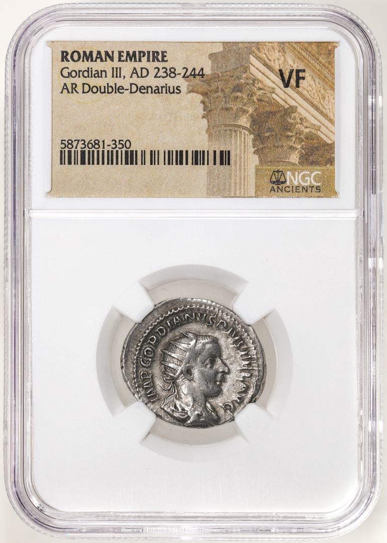 One Roman Empire 238-244 AD Gordian III AR Double-Denarius Ancient Coin NGC VF. NGC Certified.
