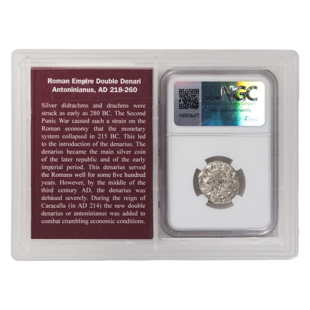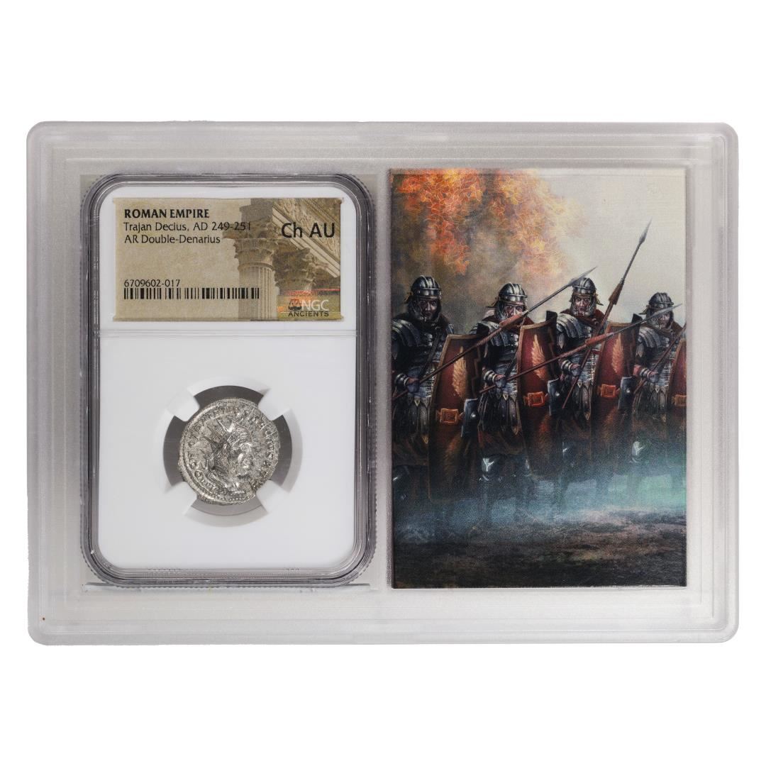 One Roman Empire 249-251 AD Trajan Decius AR Double-Denarius Ancient NGC Ch AU Story Box. NGC Certified.