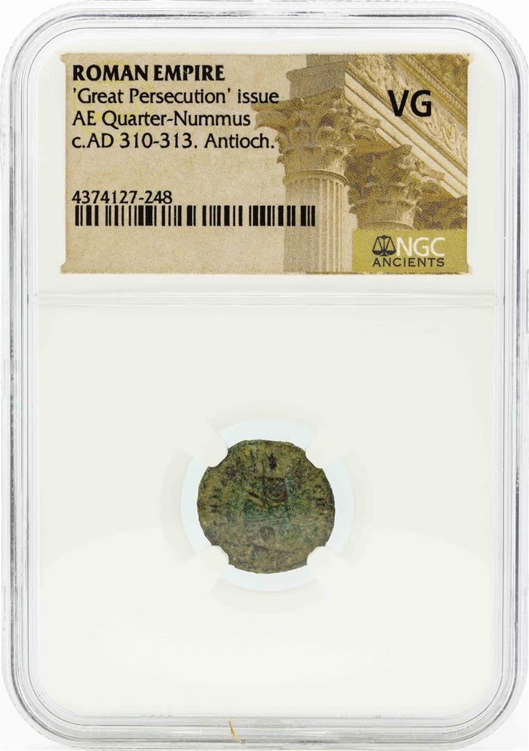 One Roman Empire AD 310-313 Antioch AE Quarter Nummus Coin NGC VG. NGC Certified.