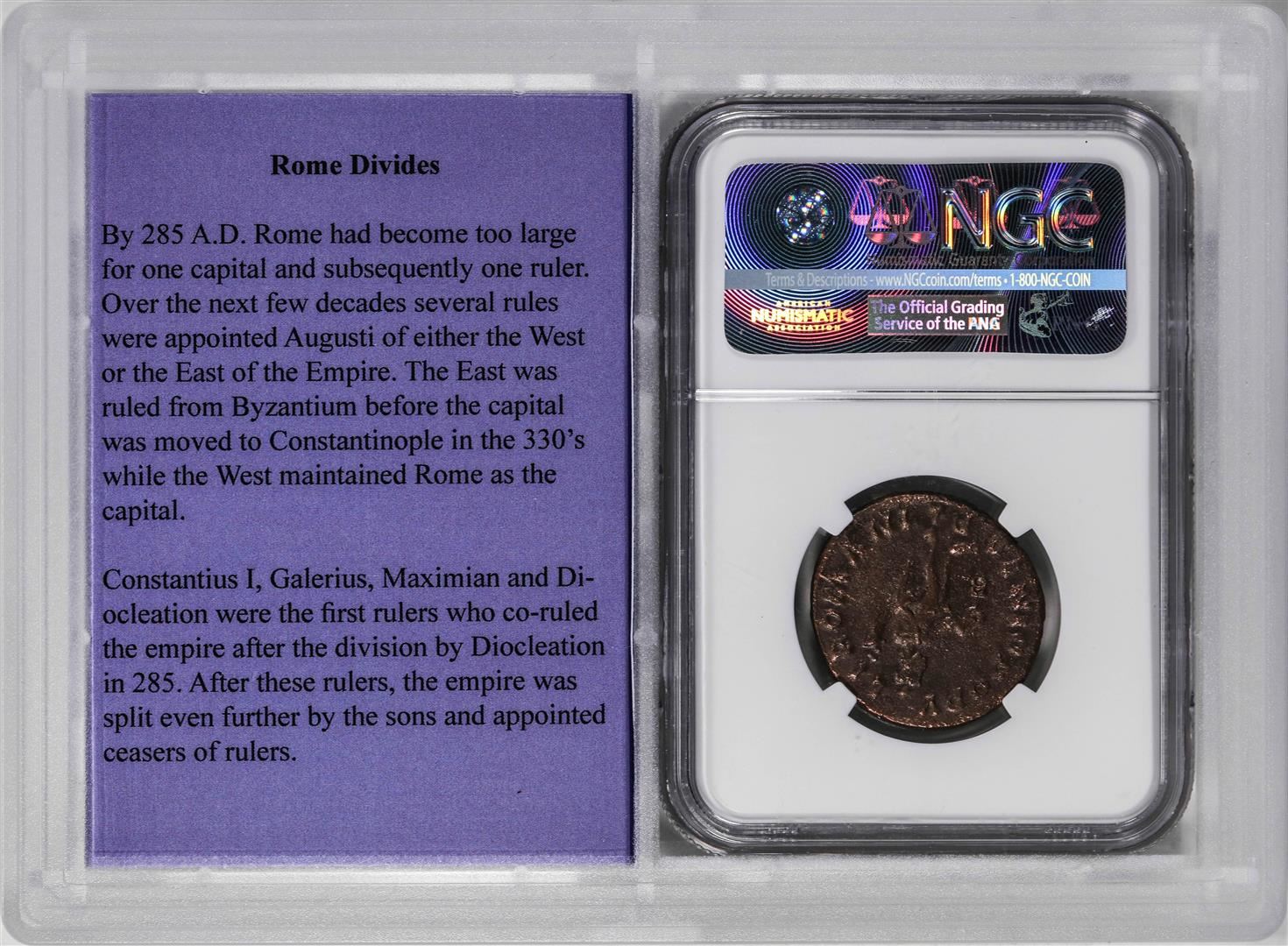 One Roman Empire Maximian 286-310 AD BI Nummus Ancient Coin NGC Ch XF Story Box. NGC Certified.