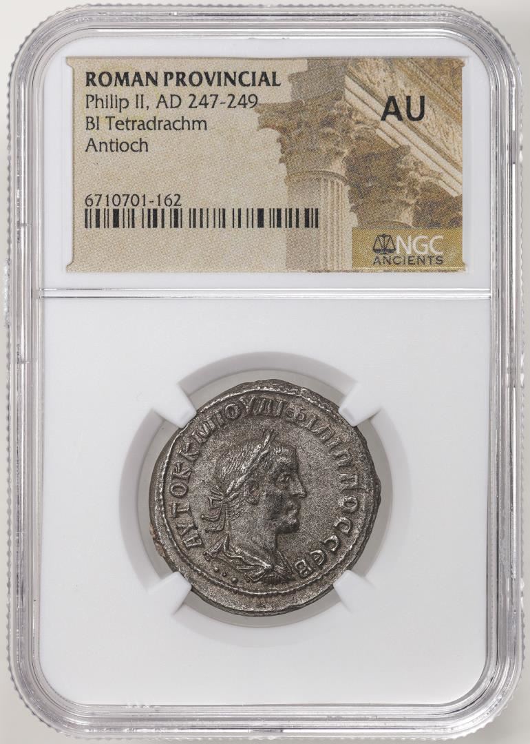 One Roman Provicinial 247-249 AD Philip II Bi Tetradrachm Ancient Coin NGC AU. NGC Certified.