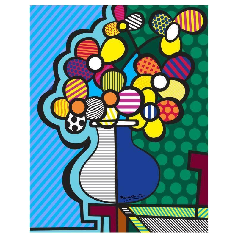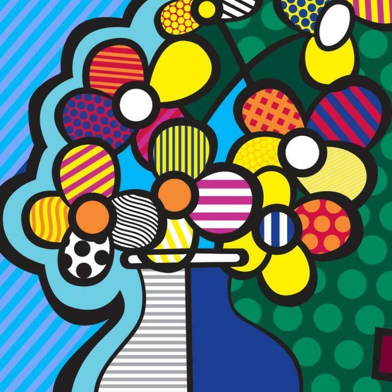 "New Flower" is an open edition giclee on canvas by Romero Britto. The piece comes hand signed by the artist and is authenticated en verso with the official Britto stamp. Measures approximately: 14" x 11".