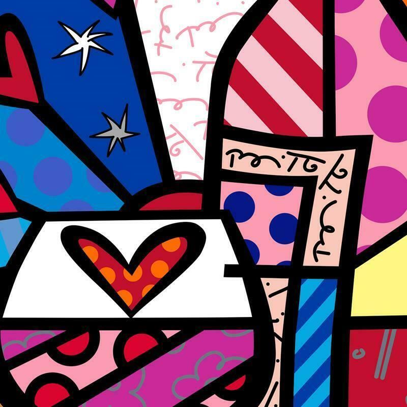 "Rose All Day" is a limited edition giclee on canvas by Romero Britto. The piece is numbered, hand signed by the artist, and is authenticated en verso with a hologram sticker and official Britto stamp. Measures approximately: 60" x 48".