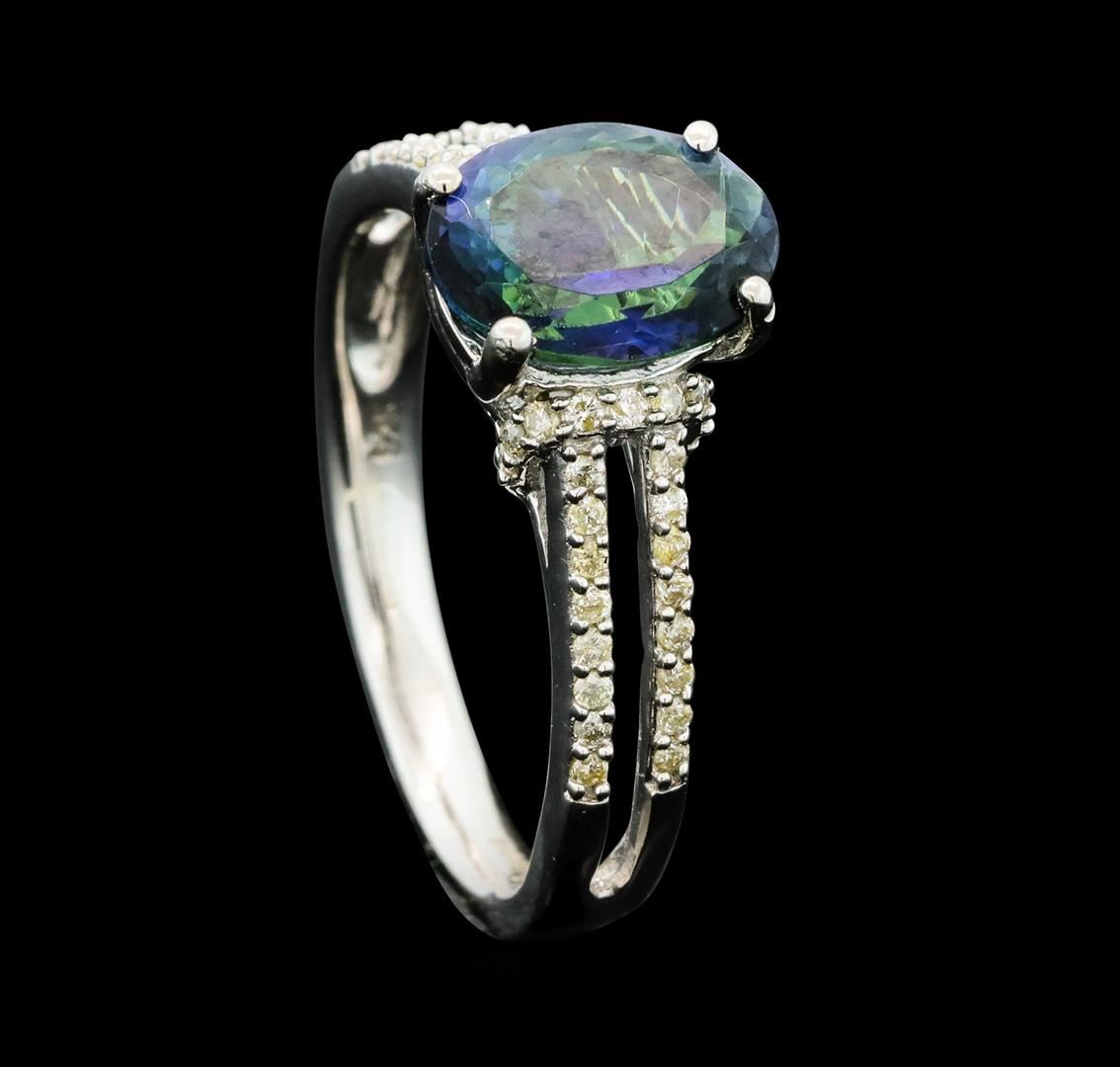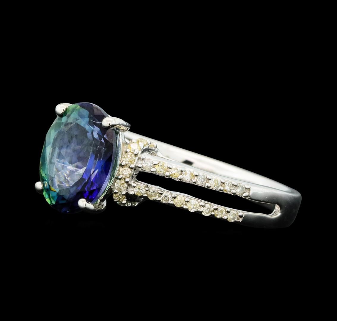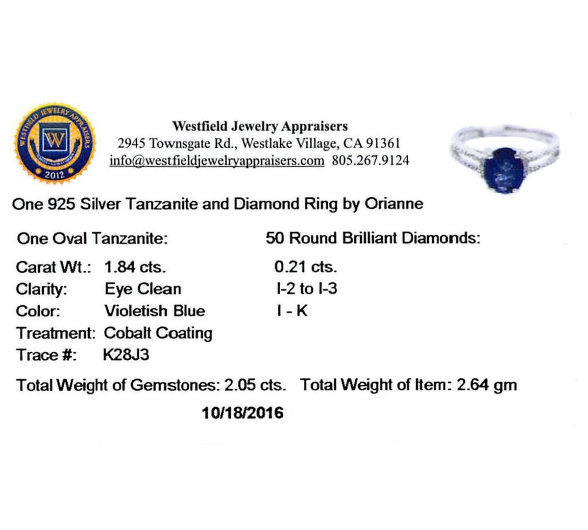 One prong set oval mixed cut natural tanzanite approximate weight of 1.84ct., clarity is eye clean, type I, medium dark, very slightly grayish, violetish blue color, (GIA vB 6/3), cut is good. Natural Tanzanite, color enhanced due to cobalt coating. The presence of the coating prevents determining the stone's actual depth of color. Transmitting light with no distortion, transparent. Grading in the setting. The cobalt coated Tanzanite has a low tolerance to ultrasonic cleaning, and should not be cleaned using this method.Tanzanite is a very rare gemstone that is only found in the country of Tanzania. Originally discovered in 1967. Tiffany & Company, named the stone Tanzanite. It is found in the Usumburu Mountains that border the Umba Valley of northern Tanzania. Tanzanite occurs in gray, brown, violet, blue, reddish-purple, & green. The gem is interesting because of its exceptional pleochroism. Rotated in different directions a tanzanite will exhibit multiple changes of color.Fifty prong set round brilliant cut diamonds approximate total weight of 50 Stones = 0.21ct. Graded in the setting. Clarity: I-2 to I-3. Color: I - K. Total Weight of Colored Stones 1.84ct. Total Weight of Diamonds 0.21ct. Total Weight of Ring 2.64gm. WJA Appraised.