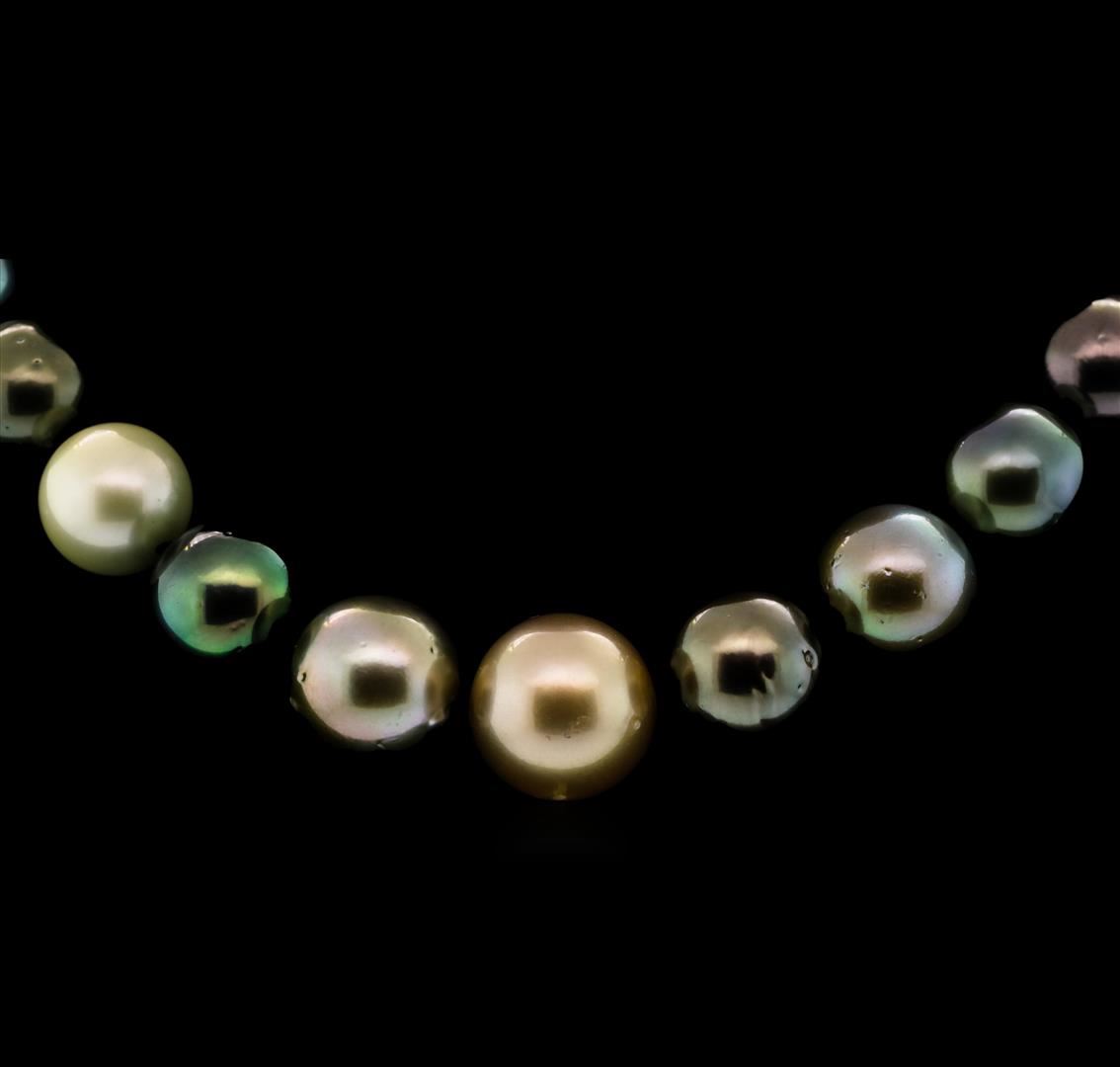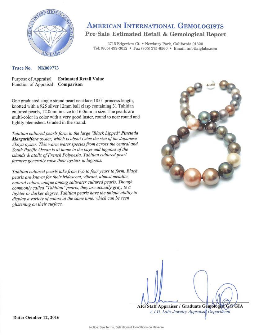 One graduated single strand pearl necklace 18.0" princess length, knotted with a 925 silver 12mm ball clasp containing 31 Tahitian pearls, 12.0mm in size to 16.0mm in size. The pearls are multi-color in color with a very good luster, round to near round, lightly blemished Graded in the strand.Tahitian cultured pearls form in the large "Black Lipped" Pinctada Margaritifera oyster, which is about twice the size of the Japanese Akoya oyster. This warm water species from across the central and South Pacific Ocean is at home in the bays and lagoons of the islands & atolls of French Polynesia. Tahitian cultured pearl farmers generally raise their oysters in lagoons.Tahitian cultured pearls take from two to four years to form. Black pearls are known for their iridescent, vibrant, almost metallic natural colors, unique among saltwater cultured pearls. Though commonly called "Tahitian" pearls, they are actually gray, to a lighter or darker degree. Tahitian pearls have the unique ability to display a variety of colors at the same time, which can be seen glistening on their surface. AIG Appraised.