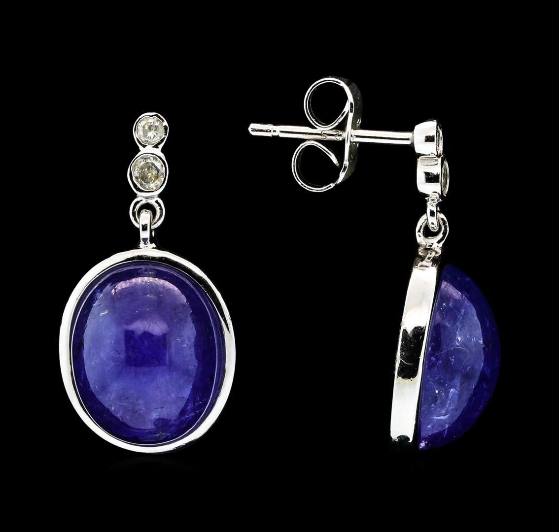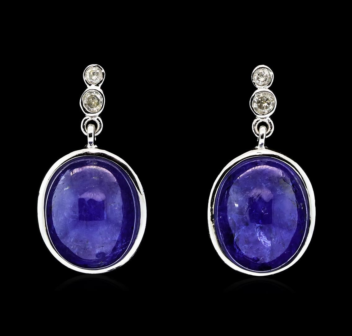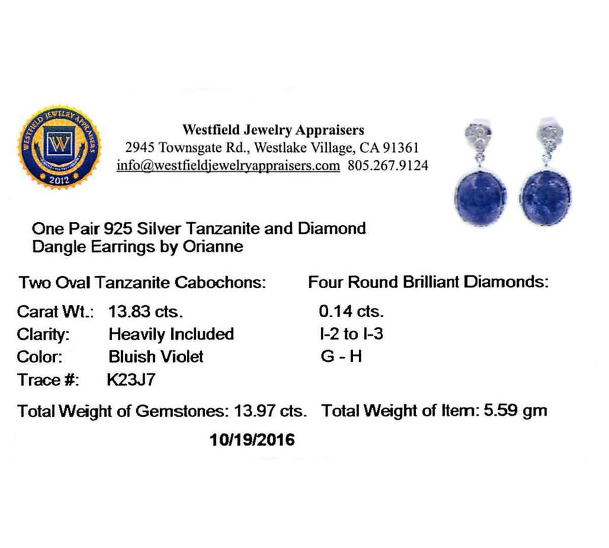 One pair of 925 silver Tanzanite and diamond dangle earrings. 4 round brilliant diamonds = 0.14ct. Graded in the setting. Clarity: I-2 to I-3. Color: G - H. Total Weight of Colored Stones 13.83ct. Total Weight of Diamonds 0.14ct. Total Weight of Earrings 5.59gm. WJA Appraised.