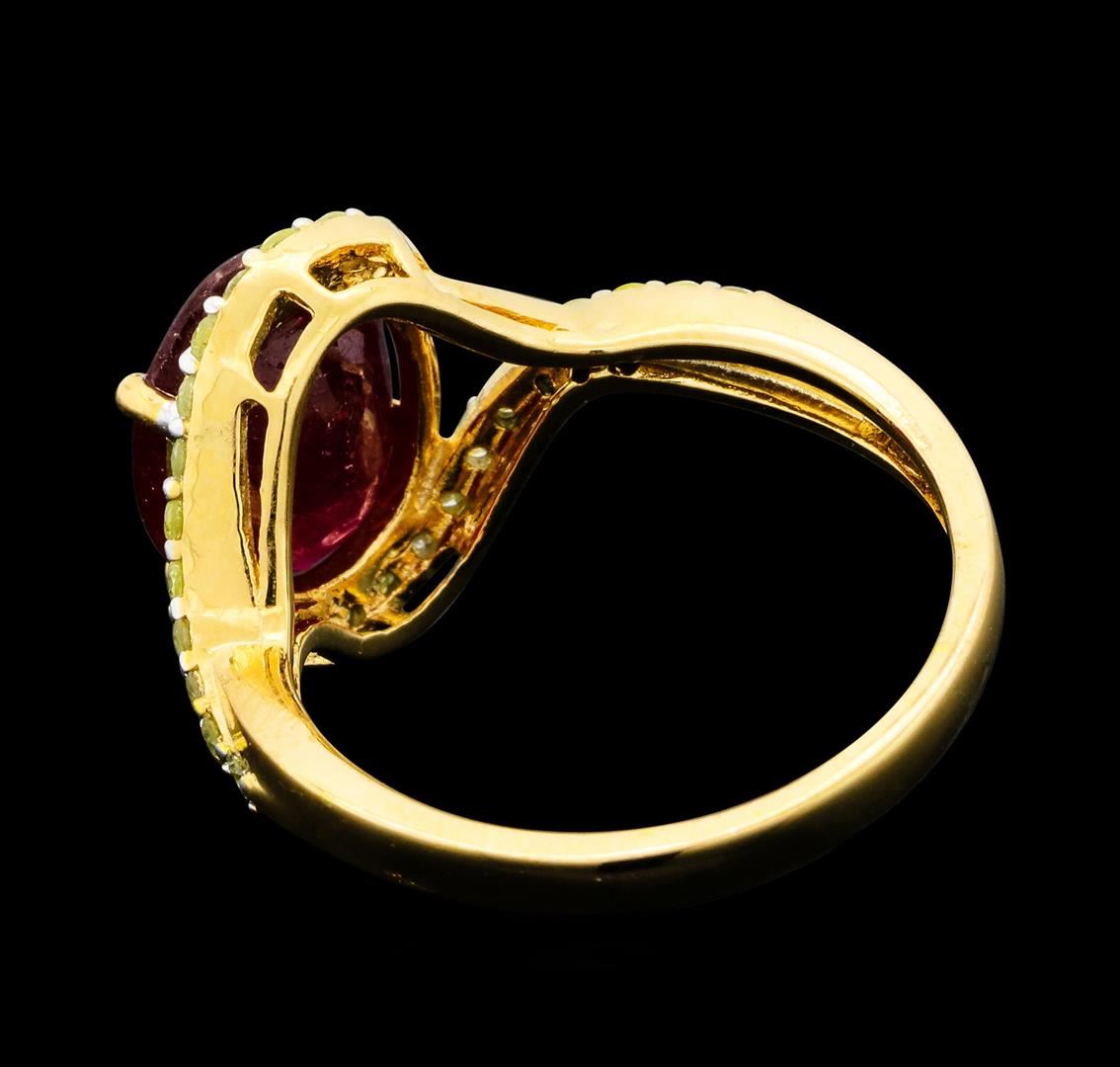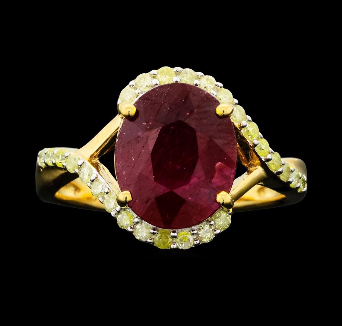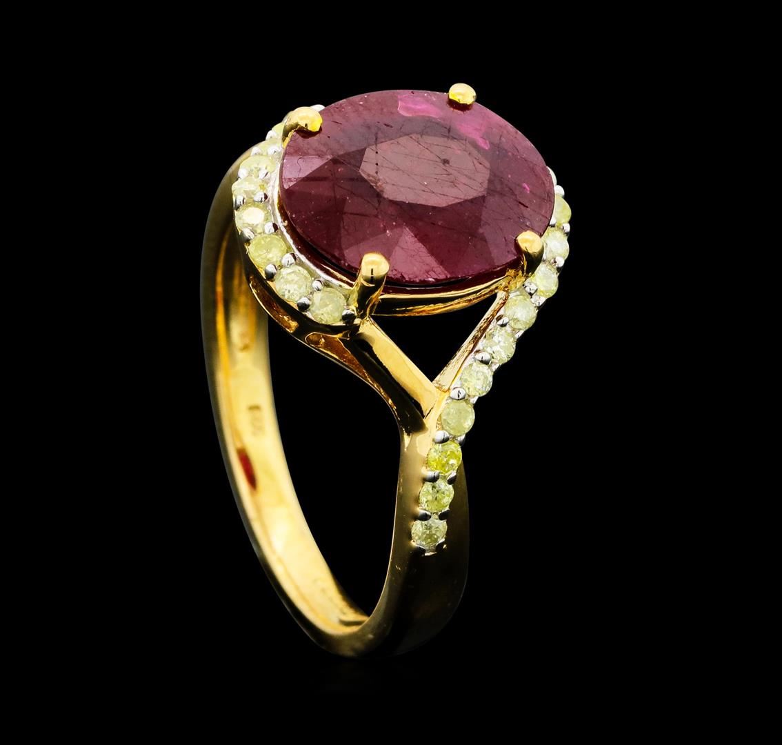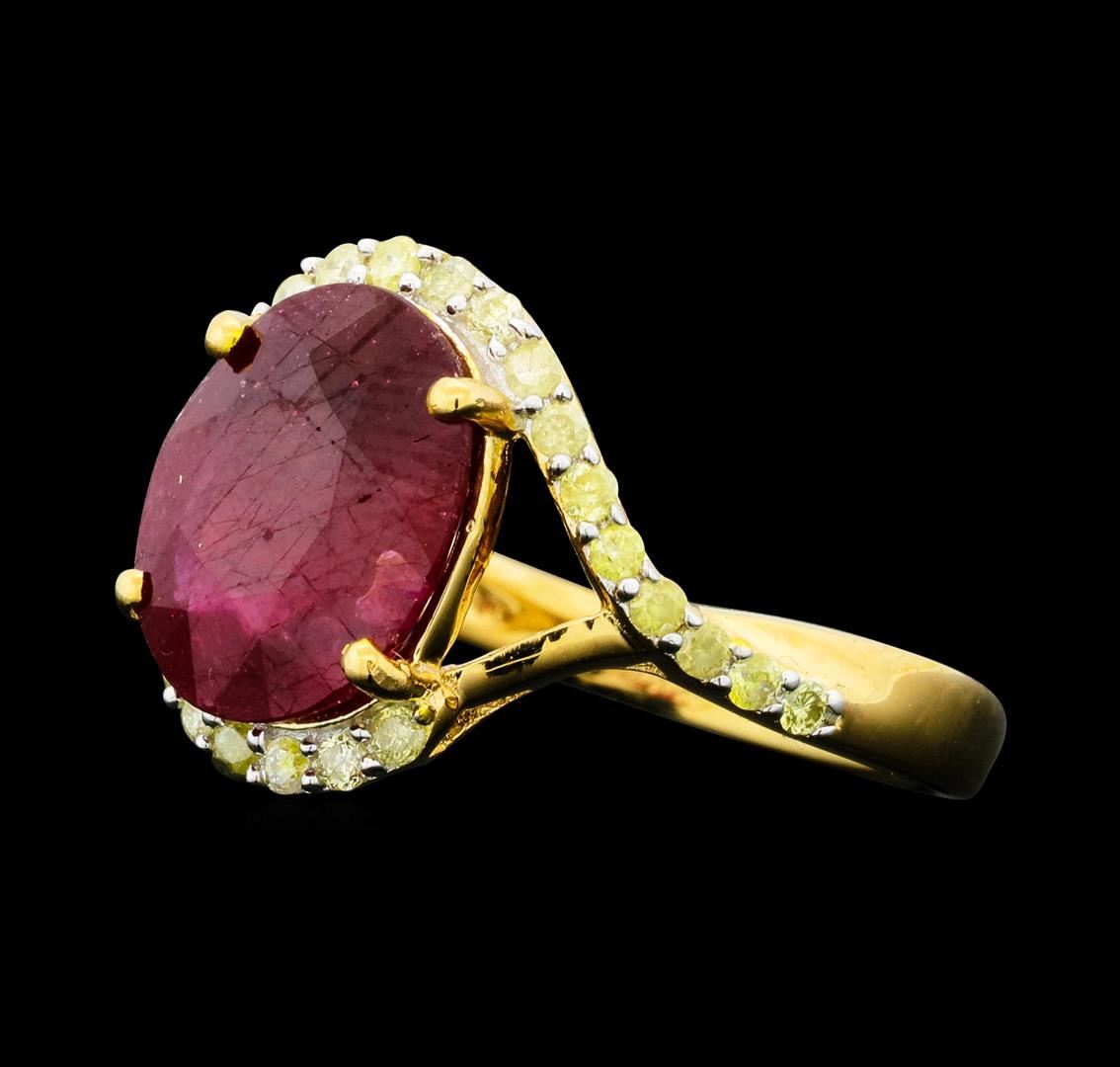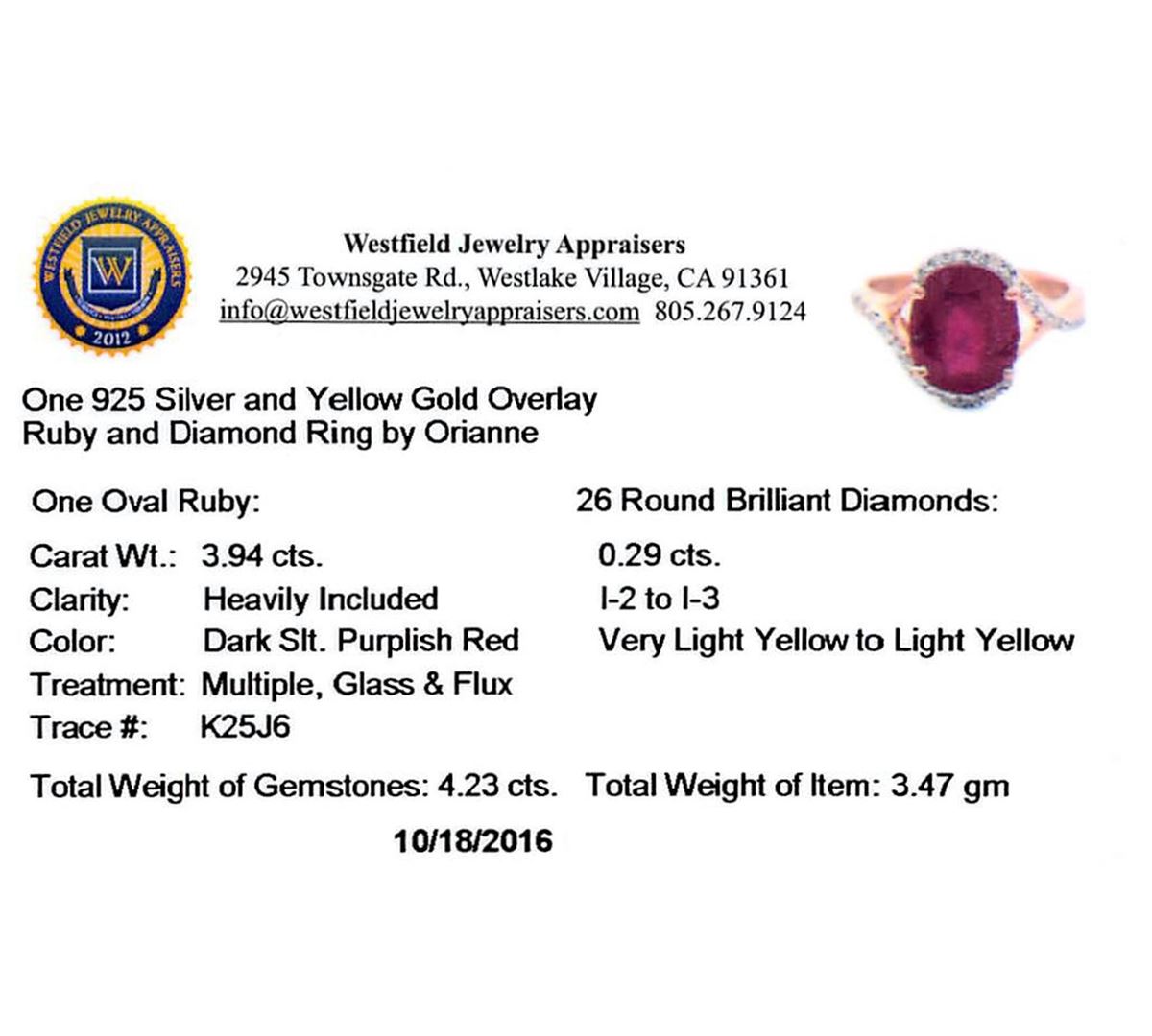 One-half millimeter wide band. Bright polish finish with a yellow gold overlay. Trademark is Orianne. Identified with markings of "925". Condition is new, good workmanship. Containing: One prong set oval mixed cut natural ruby approximate weight of 3.94ct., clarity is heavily included, type II, dark, very slightly brownish, slightly purplish red color, (GIA slpR 7/3), cut is good. Transmitting light somewhat diffusely, transparent to translucent. Naturally occurring internal & external characteristics are present. Indications of laboratory high temperature heat treatment, with glass & flux additives. Graded in the setting. Ruby has a low tolerance to rhodium plating, repolishing the surface, & ultrasonic cleaning.Twenty-Six prong set round brilliant cut diamonds approximate total weight of 26 Stones = 0.29ct. The group contains a mix of natural very light yellow and light yellow color diamonds. Graded in the setting. Clarity: I-2 to I-3. Total Weight of Colored Stones 3.94ct. Total Weight of Diamonds 0.29ct. Total Weight of Ring 3.47gm. WJA Appraised.