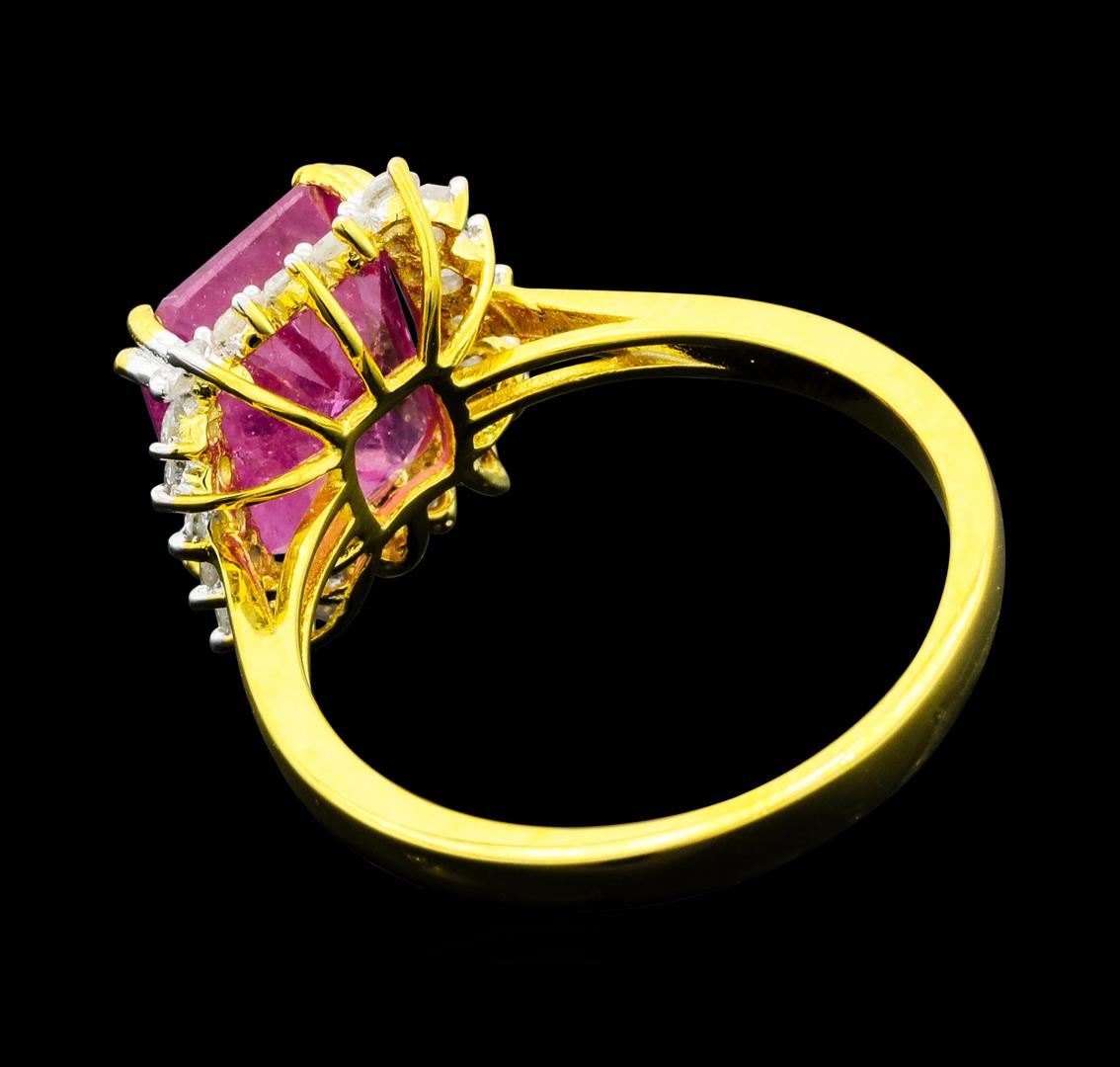 One prong set rectangular step cut natural ruby approximate weight of 4.22ct., clarity is heavily included, type II, medium, very slightly brownish, strongly purplish red color, (GIA stpR 5/3), cut is good. Transmitting light somewhat diffusely, transparent to translucent. Naturally occurring internal & external characteristics are present. Indications of laboratory high temperature heat treatment, with glass & flux additives. Graded in the setting. Ruby has a low tolerance to rhodium plating, repolishing the surface, & ultrasonic cleaning.Twenty prong set round brilliant cut diamonds approximate total weight of 20 Stones = 0.46ct. Graded in the setting. Clarity: I-2 to I-3. Color: G - I. Total Weight of Colored Stones 4.22ct. Total Weight of Diamonds 0.46ct. Total Weight of Ring 3.37gm. WJA Appraised.