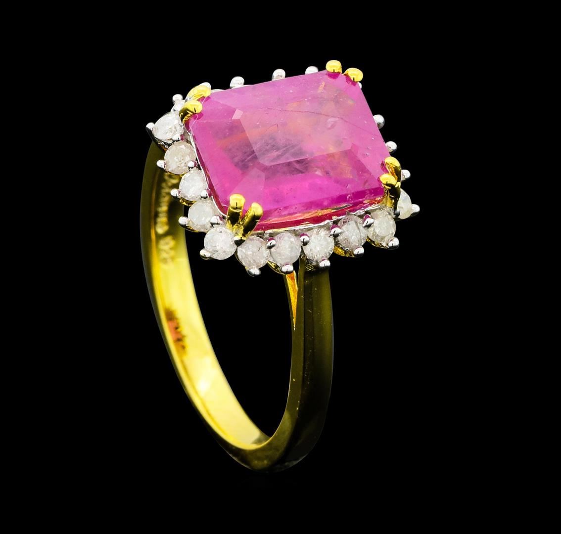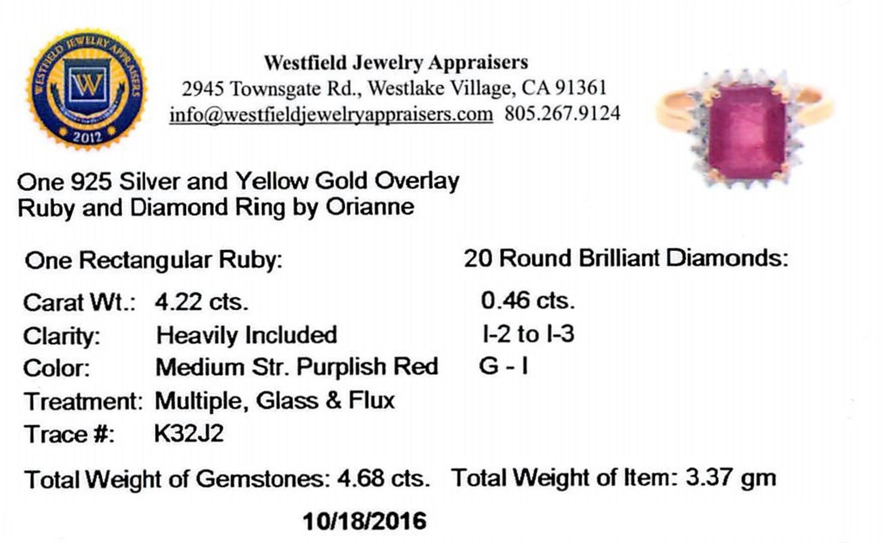 One prong set rectangular step cut natural ruby approximate weight of 4.22ct., clarity is heavily included, type II, medium, very slightly brownish, strongly purplish red color, (GIA stpR 5/3), cut is good. Transmitting light somewhat diffusely, transparent to translucent. Naturally occurring internal & external characteristics are present. Indications of laboratory high temperature heat treatment, with glass & flux additives. Graded in the setting. Ruby has a low tolerance to rhodium plating, repolishing the surface, & ultrasonic cleaning.Twenty prong set round brilliant cut diamonds approximate total weight of 20 Stones = 0.46ct. Graded in the setting. Clarity: I-2 to I-3. Color: G - I. Total Weight of Colored Stones 4.22ct. Total Weight of Diamonds 0.46ct. Total Weight of Ring 3.37gm. WJA Appraised.