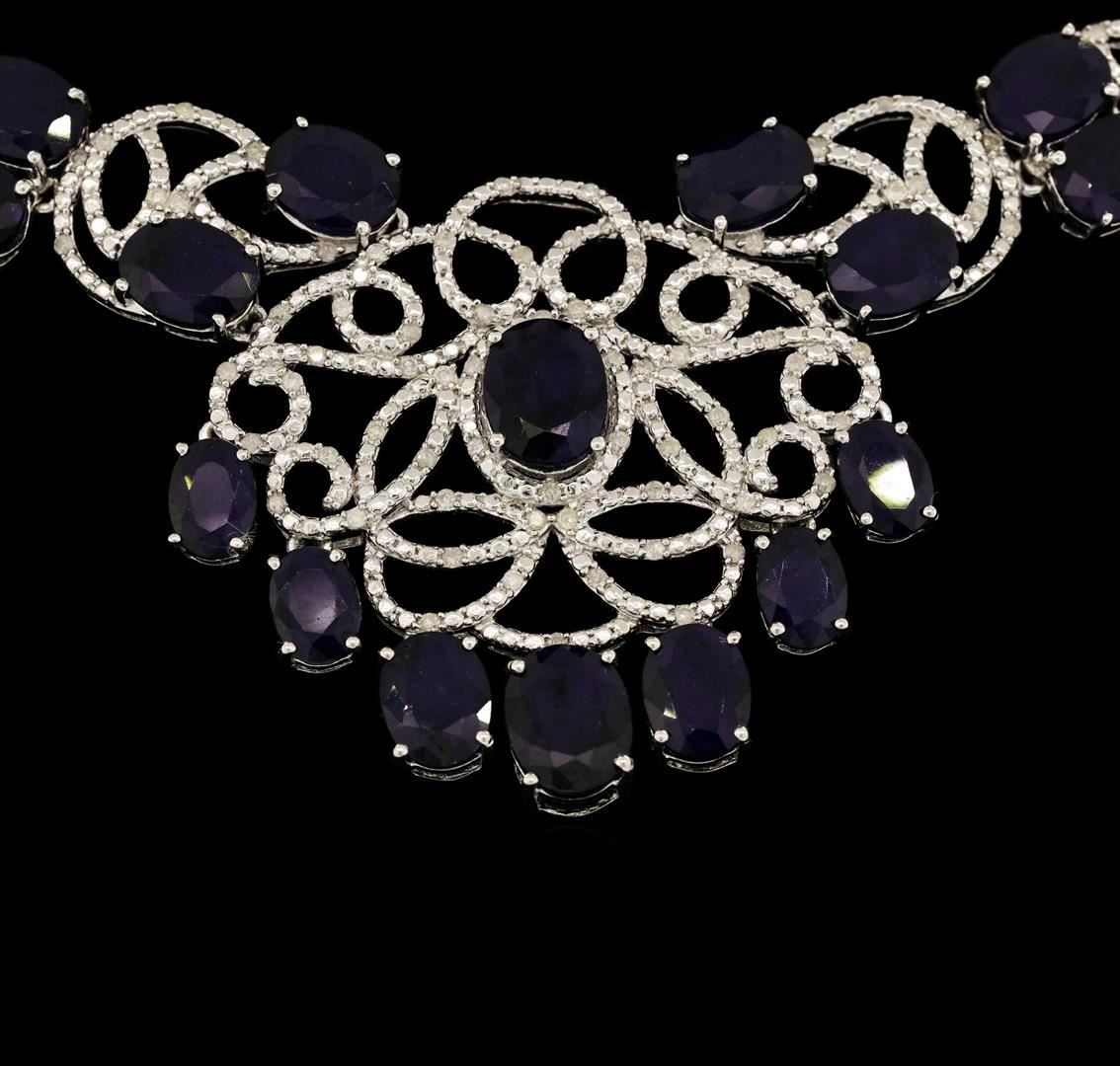 One 17 inch in legth .925 Silver Sapphire and Diamond Necklace. ones = 1.55ct. Graded in the setting. Clarity: I-2 to I-3. Color: E - G. (46) Oval Sapphires with a Total Weight of Colored Stones 56.49ct. (204) Round Brilliant Diamonds with a Total Weight of Diamonds 1.55ct. Total Weight of Necklace 40.20gm. AIG Appraised.