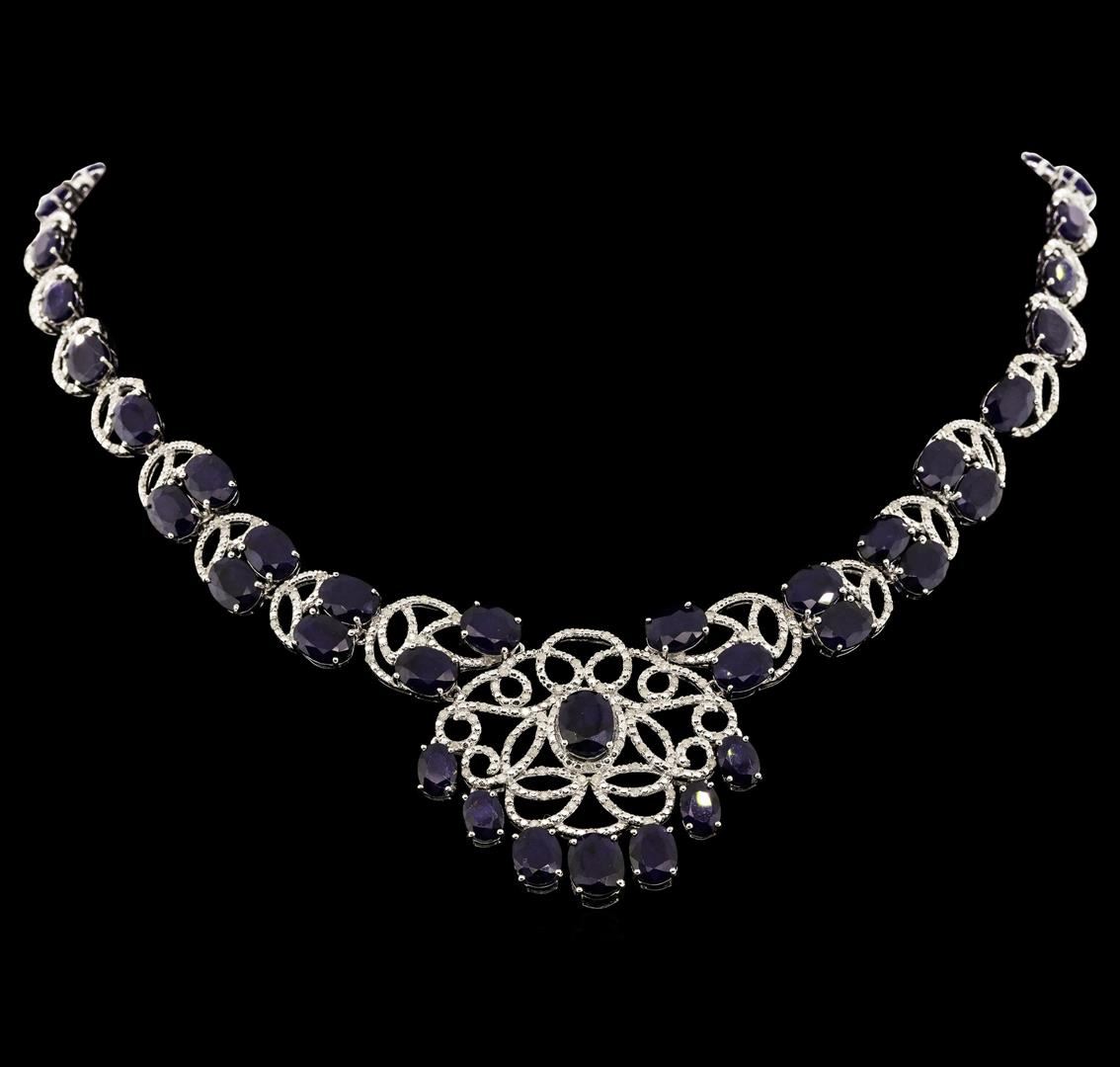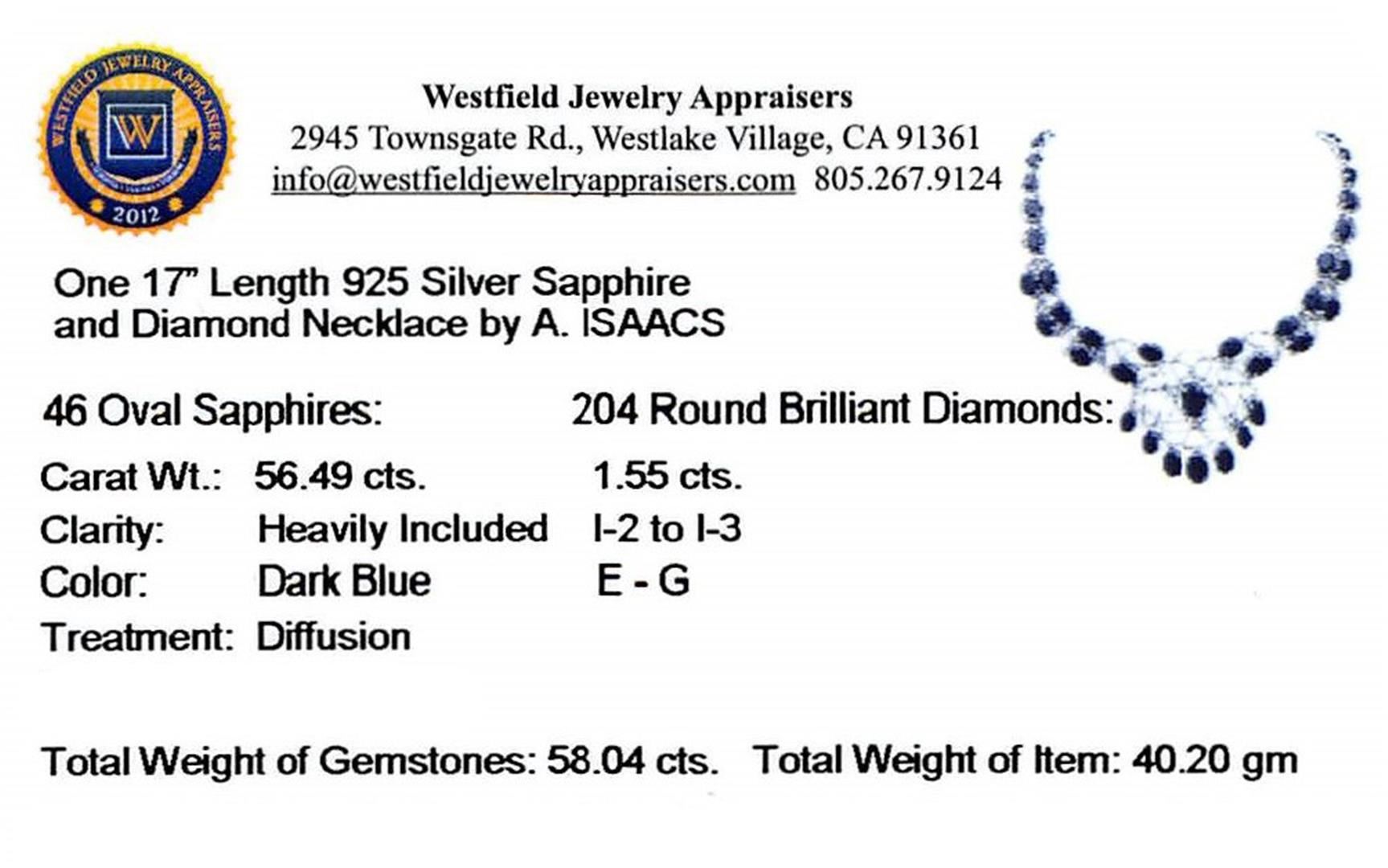 One 17 inch in legth .925 Silver Sapphire and Diamond Necklace. ones = 1.55ct. Graded in the setting. Clarity: I-2 to I-3. Color: E - G. (46) Oval Sapphires with a Total Weight of Colored Stones 56.49ct. (204) Round Brilliant Diamonds with a Total Weight of Diamonds 1.55ct. Total Weight of Necklace 40.20gm. AIG Appraised.
