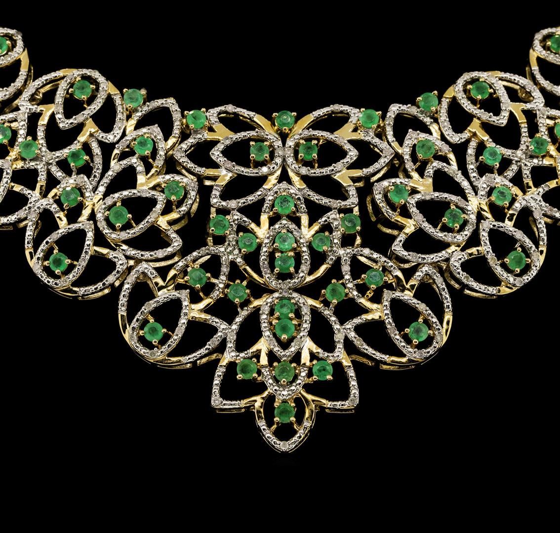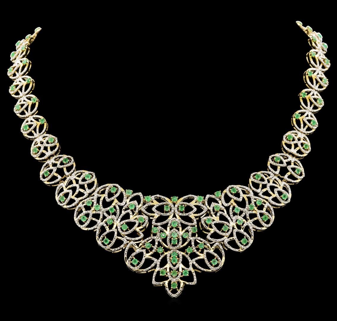One-quarter inch length necklace features an intricate emerald and diamond lattice design supported by stylized emerald and diamond disc links, terminating in a diamond accented box clasp with twin safeties. Bright polish finish with yellow gold overlay. Trademark is A. ISAACS. Identified with markings of "925". Condition is new, excellent workmanship. Containing: One hundred ten prong set round mixed cut natural emeralds approximate total weight of 7.20ct., clarity is heavily included, type III, medium, very slightly grayish, very slightly bluish green color, (GIA vslbG 5/3), cut is good. Transmitting light somewhat diffusely, transparent to translucent. Naturally occurring internal & external characteristics are present. Color grade is an average for the group. Indications of oil residue. Graded in the setting. Four Hundred One prong set round brilliant cut diamonds approximate total weight of 401 Stones = 2.68ct. Graded in the setting. Clarity: I-2 to I-3. Color: E - G. Total Weight of Colored Stones 7.20ct. Total Weight of Diamonds 2.68ct. Total Weight of Necklace 52.35gm. WJA Appraised.
