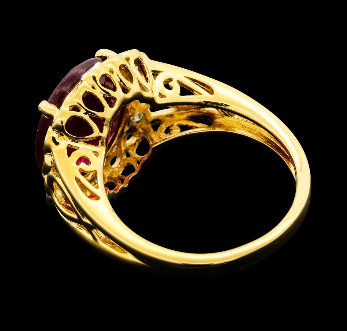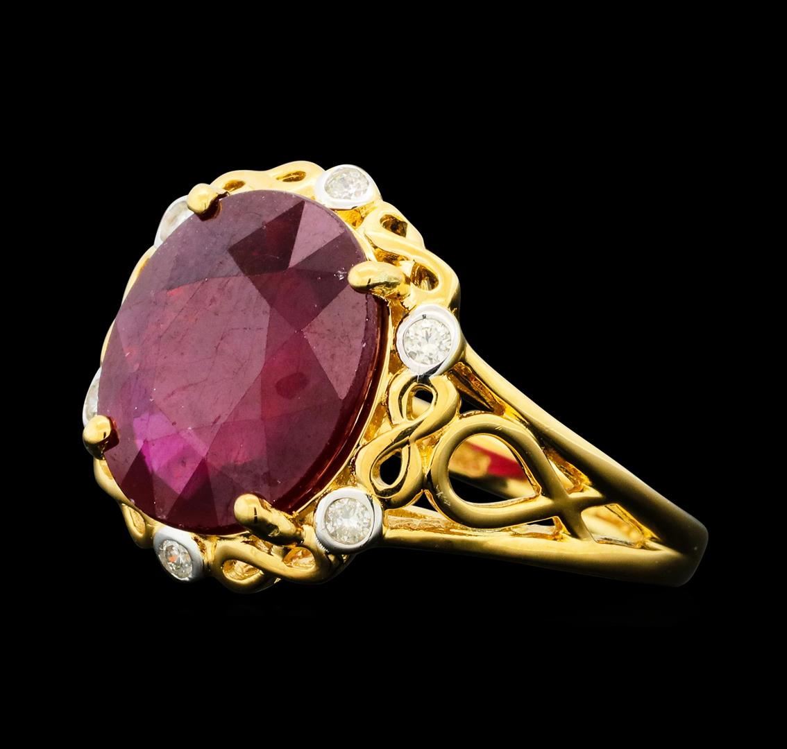 One prong set oval mixed cut natural ruby approximate weight of 7.56ct., clarity is heavily included, type II, dark, very slightly brownish, slightly purplish red color, (GIA slpR 7/3), cut is good. Transmitting light somewhat diffusely, transparent to translucent. Naturally occurring internal & external characteristics are present. Indications of laboratory high temperature heat treatment, with glass & flux additives. Graded in the setting. Ruby has a low tolerance to rhodium plating, repolishing the surface, & ultrasonic cleaning.Six bezel set round brilliant cut diamonds approximate total weight of 6 Stones = 0.13ct. Graded in the setting. Clarity: I-1 to I-2. Color: G - I. Total Weight of Colored Stones 7.56ct. Total Weight of Diamonds 0.13ct. Total Weight of Ring 5.02gm. WJA Appraised.