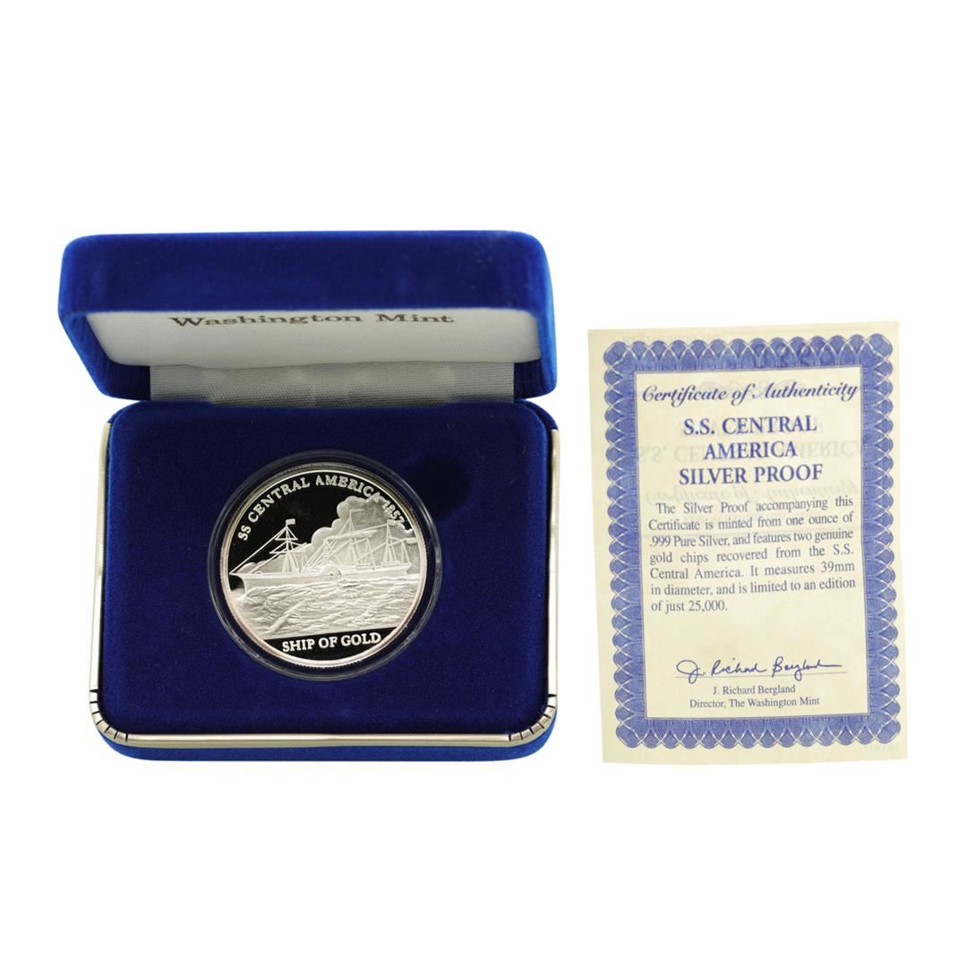 One SS Central America .999 Fine Silver Proof Metal w/ Gold Nugget w/Box & COA.