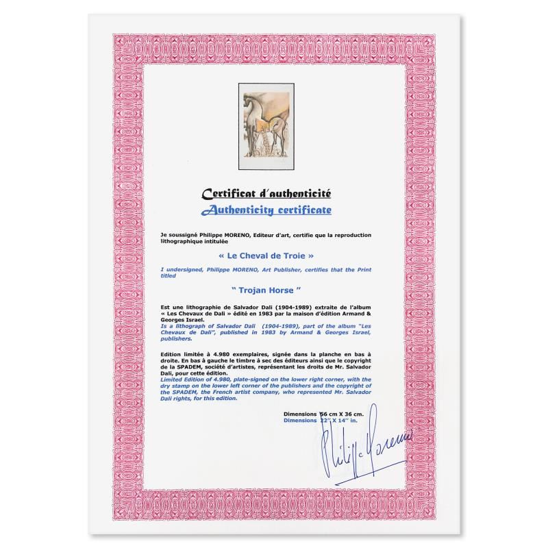 "Cheval de Troie (Trojan Horse)" is a limited edition lithograph by Salvador Dali (1904-1989), bearing the plate signature of the artist. This piece was published by Armand & Georges Israel in 1983 during Dali's lifetime and under his supervision. This piece was printed on Velin D'arches paper in Paris. This work is referenced in The Official Catalog of the Graphic Works of Salvador Dali (Albert Fields). This piece comes custom framed. Includes Certificate of Authenticity. Measures approx. 20" x 28" (frame), 14" x 22" (image).