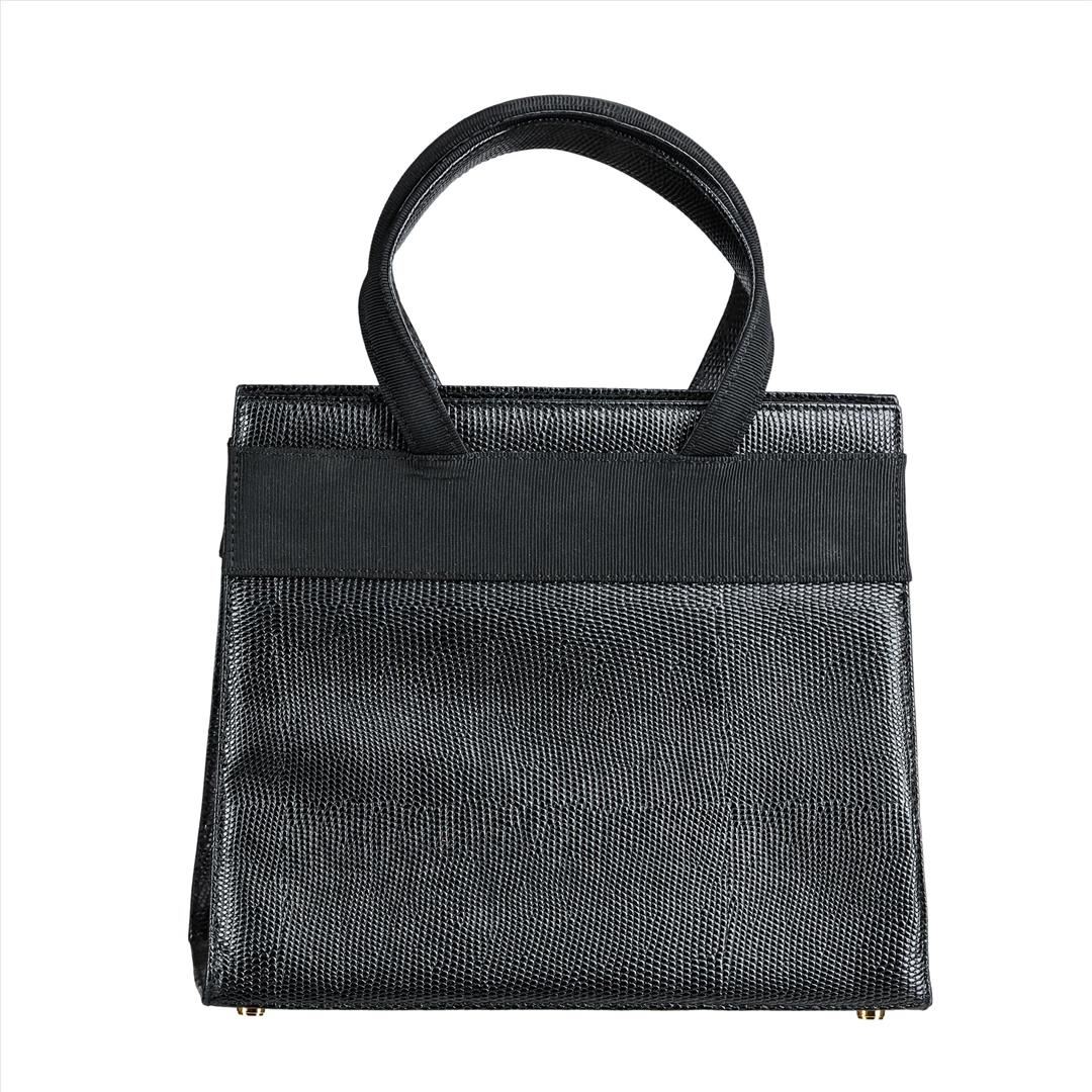 This Authentic Salvatore Ferragamo Vara Ribbon Handbag features textured black leather, Gold-tone hardware and iconic ribbon detailing across the front. Magnetic closure opens to a large textile lined interior offering an inside zippered compartment. Leather tag stamped Salvatore Ferragamo AQ-214178 Made in Italy is sewn inside. Approximate Height 8.58. Depth 3.77. Great Pre-loved condition with minor wear. Please see photos.