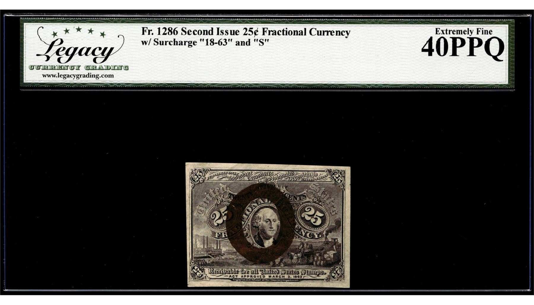 One Second Issue 25 Cents Fractional Currency Note Fr.1286 Legacy Extremely Fine 40PPQ. Legacy Graded.