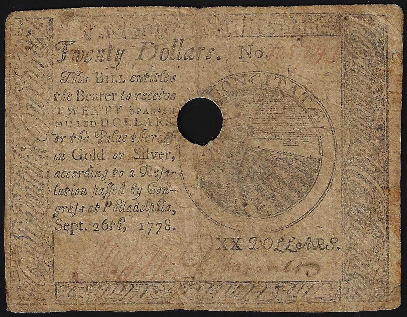 One September 26, 1778 $20 Continental Currency Note.