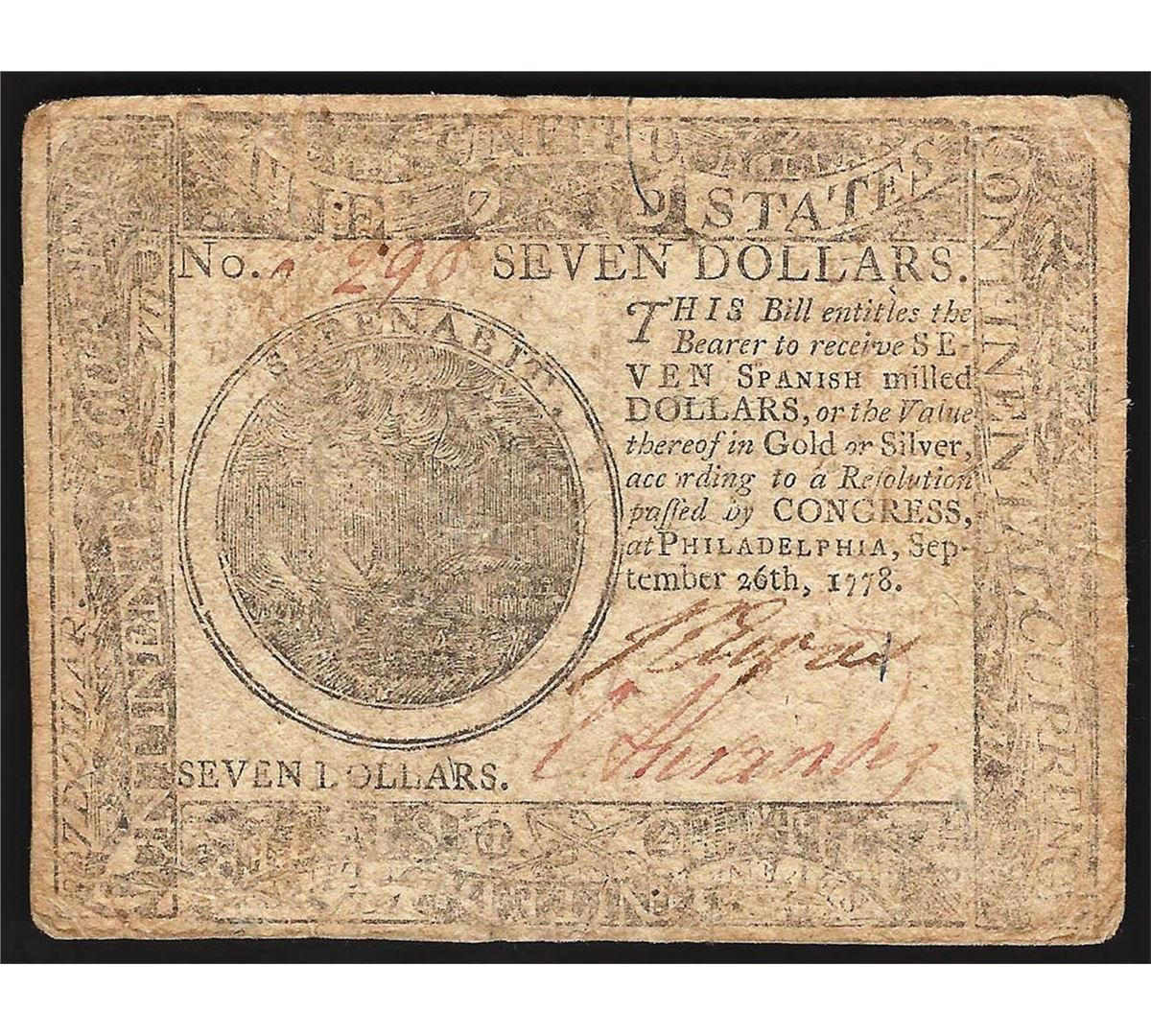 One September 26, 1778 $7 Spanish Milled Continental Currency Note.